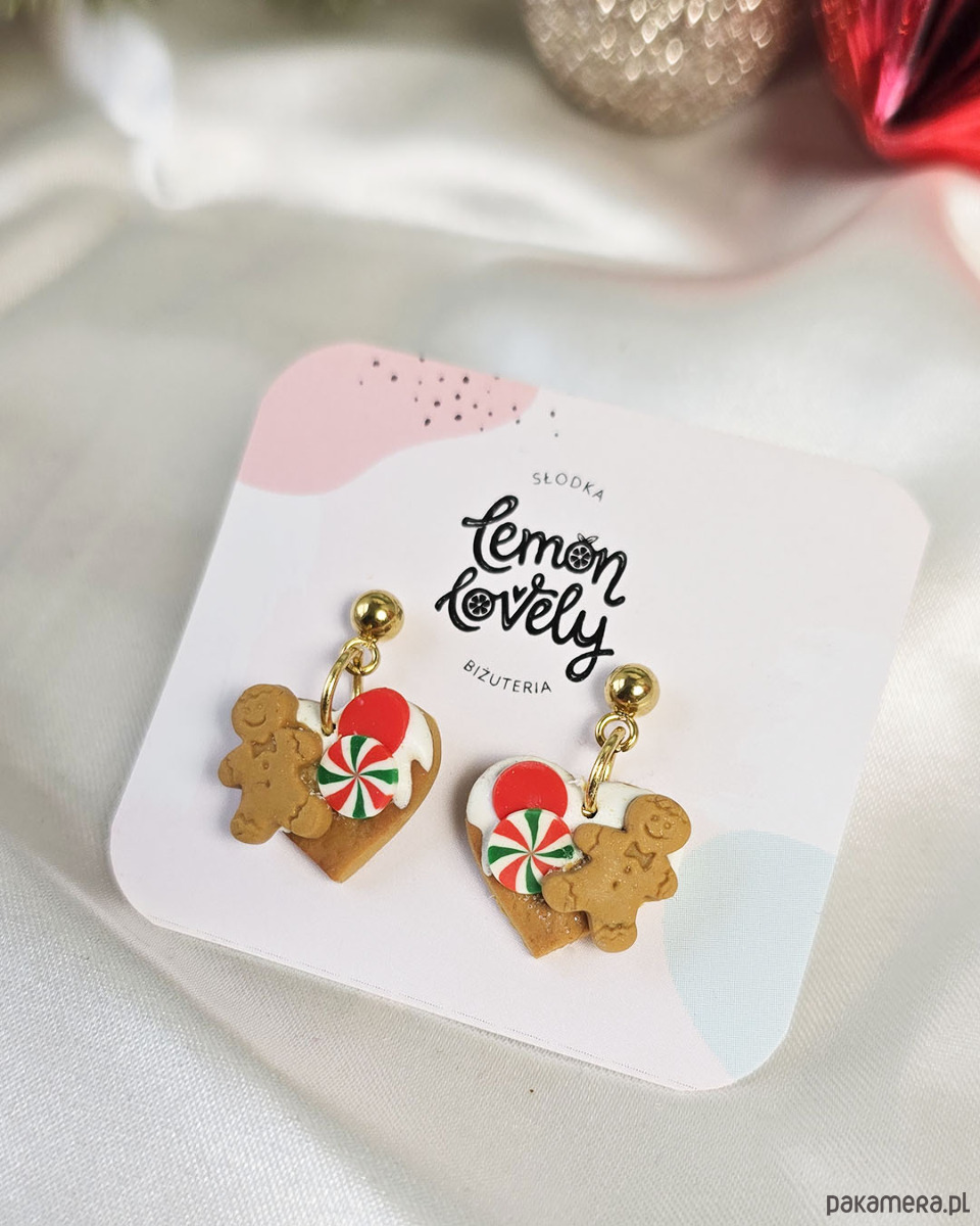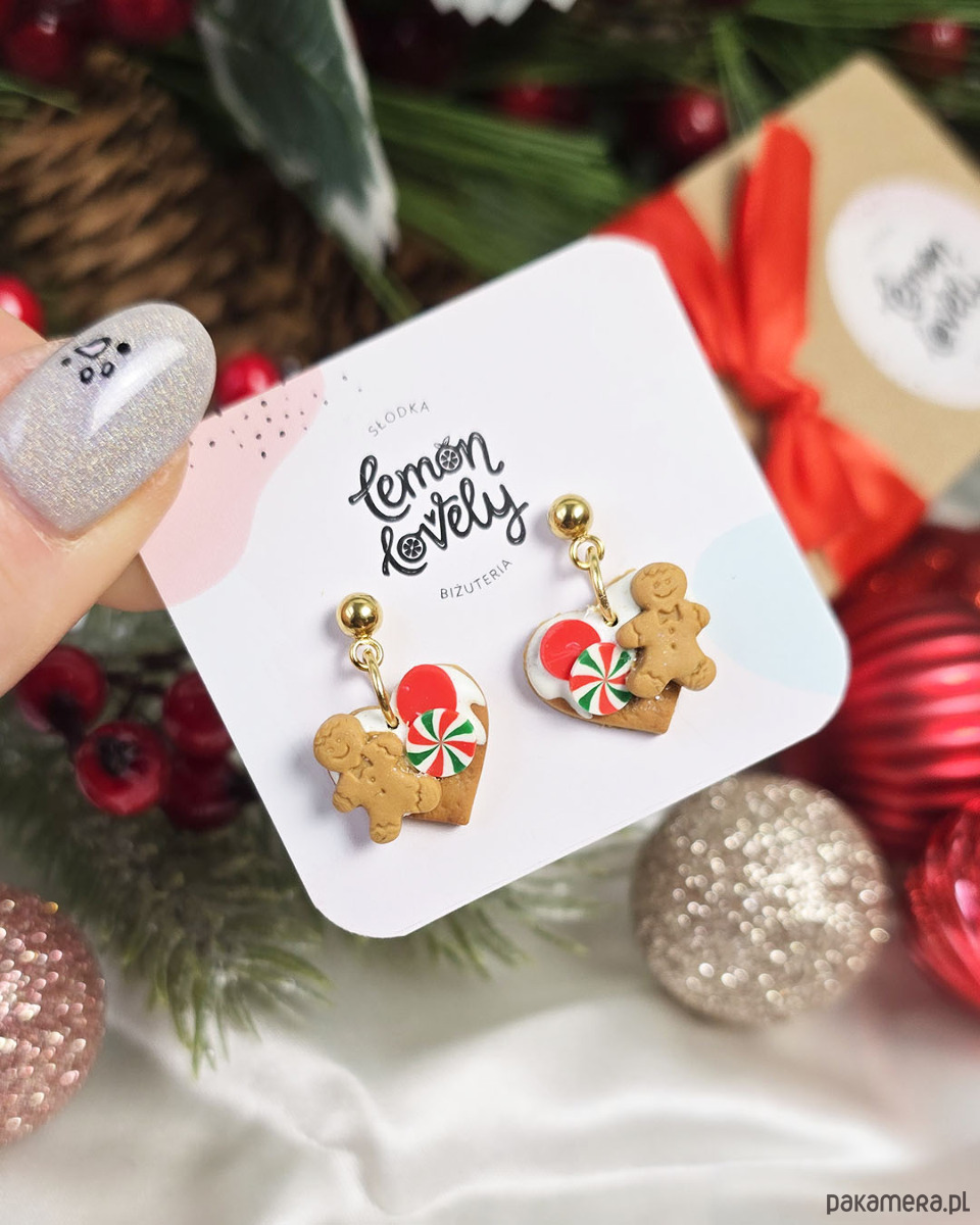 To świąteczne kolczyki stworzone z myślą o młodszych dziewczynkach- miniaturowe pierniczki zawieszone na sztyftach kulkach- dzięki temu pierniczki wiszą tuż pod uchem.