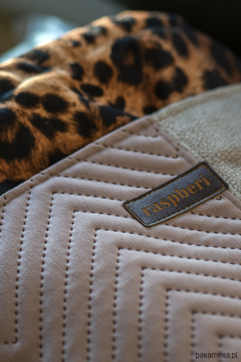 Wykonany z weluru w panterkę. Z przodu oraz z na tyle torebki kieszenie (np. na telefon czy chusteczki) z beżowego weluru oraz pudroworóżowego pikowanego weluru.