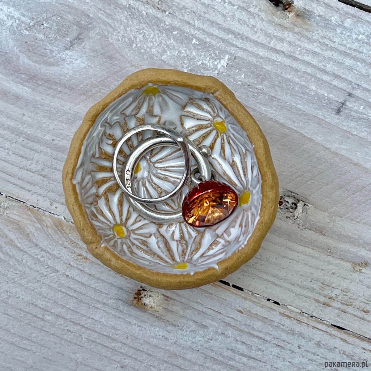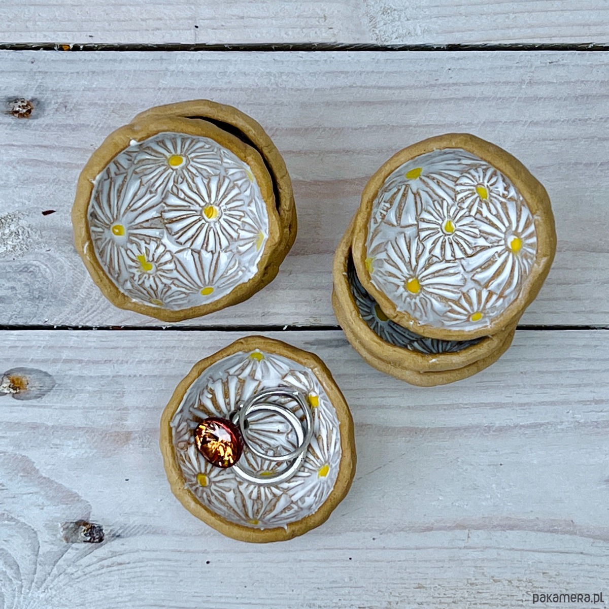 Maleńka miseczka ceramiczna z wytłoczonym motywem stokrotek z żółtymi środkami o średnicy około 4 cm. Naczynko pomieści pierścionki podczas mycia rąk w łazience lub podczas pracy w kuchni. Sprawdzi się idealnie na nocnej szafce do przechowania kolczyków. To idealny prezent dla siostry lub przyjaciółki.