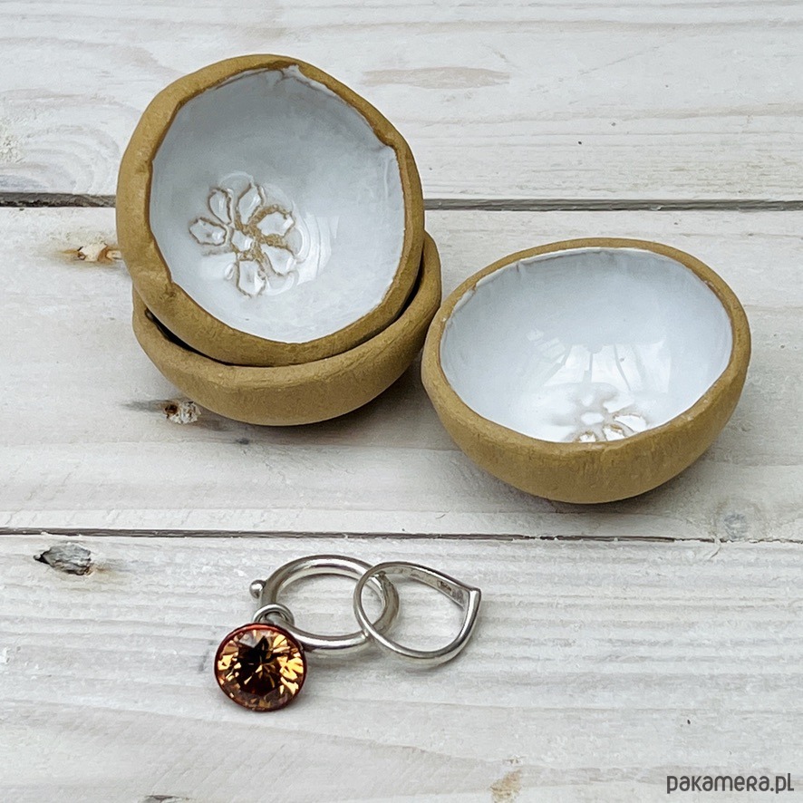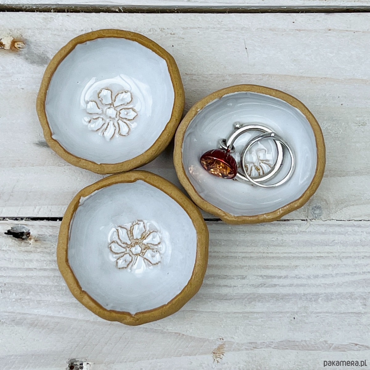 Maleńka miseczka ceramiczna z wytłoczonym motywem margerytki o średnicy około 4 cm. Naczynko pomieści pierścionki podczas mycia rąk w łazience lub podczas pracy w kuchni. Sprawdzi się idealnie na nocnej szafce do przechowania kolczyków. To idealny prezent dla siostry lub przyjaciółki.