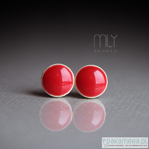 Ceramiczne okrągłe kolczyki w formie sztyftów, ręcznie wykonane z delikatnej gliny kamionkowej, jednostronnie szkliwione intensywnym czerwonym szkliwem z efektem plamek i pięknym połyskiem, na antyalergicznych sztyftach w kolorze srebrnym.Średnica ok. 6mm.. Polecam