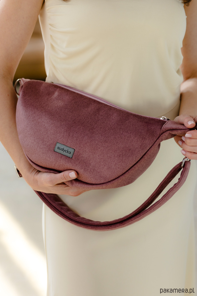 Półokrągła listonoszka w kształcie półksiężyca z weluru tapicerskiego w kolorze pudrowy róż.