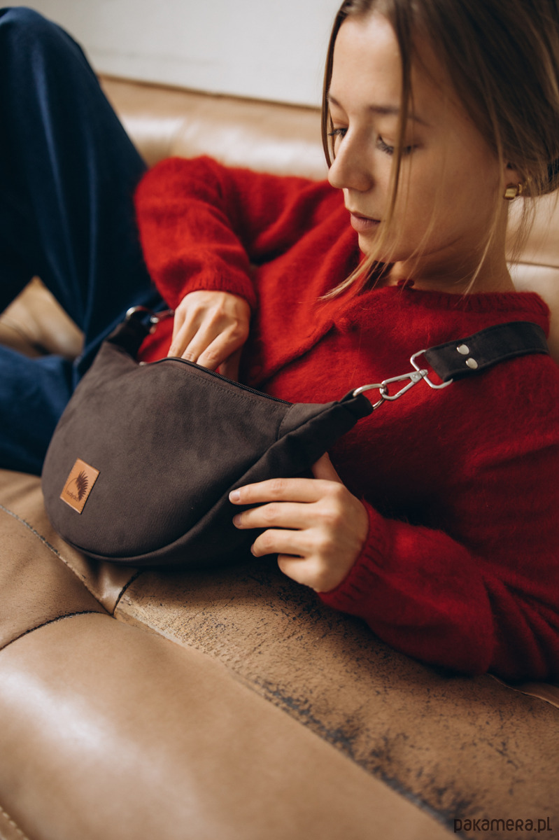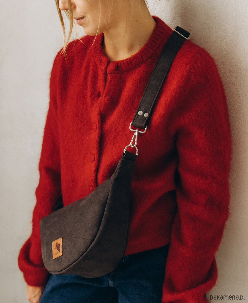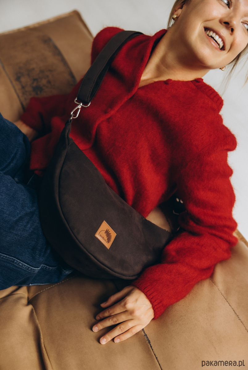 Półokrągła listonoszka w kształcie półksiężyca z nubuku ekologicznego w kolorze brunatnym.