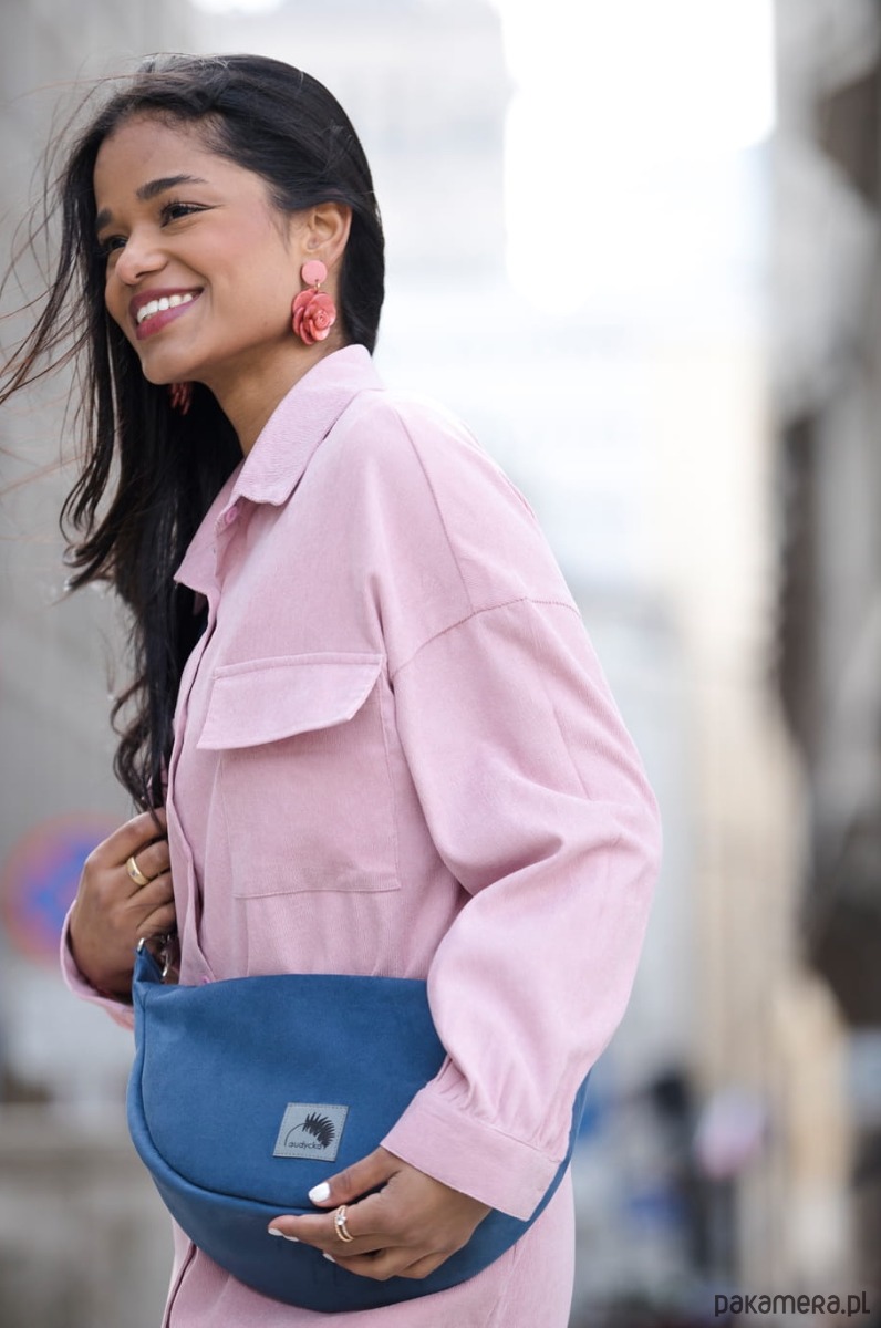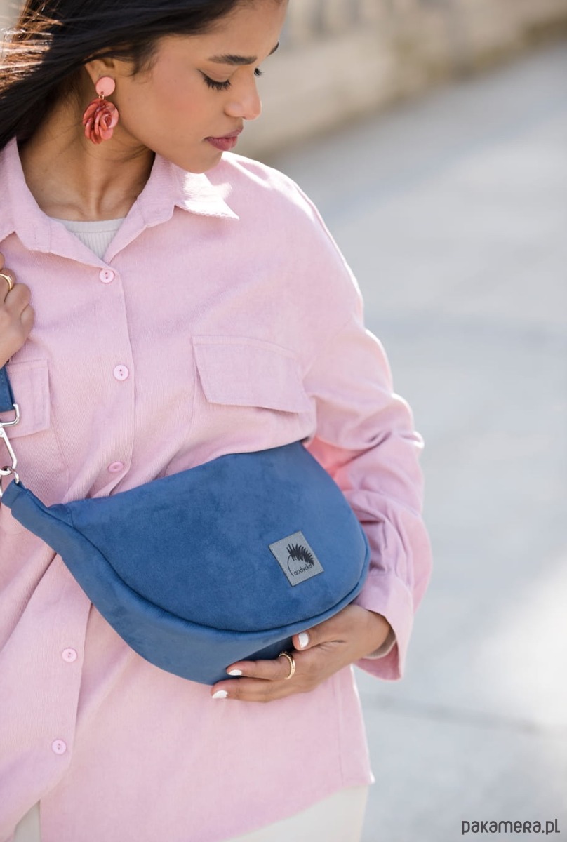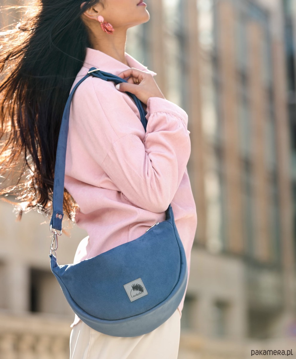 Półokrągła listonoszka w kształcie półksiężyca z nubuku ekologicznego w kolorze niebieskim.