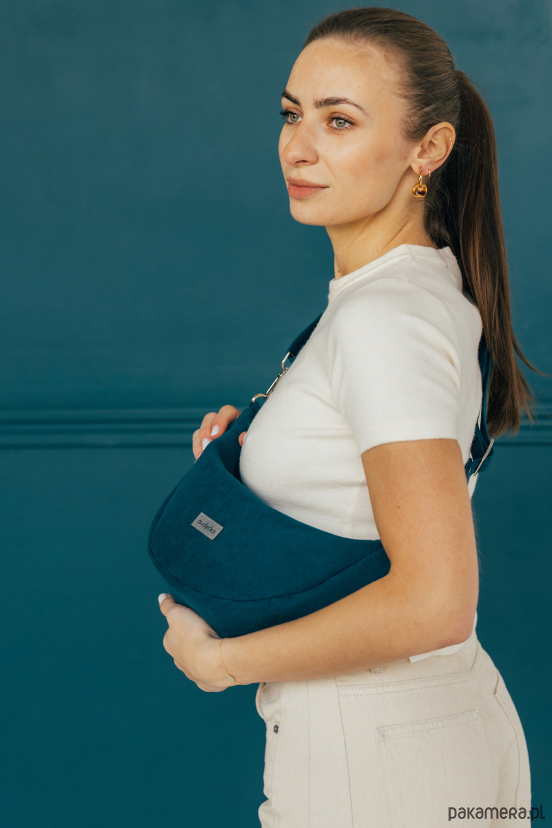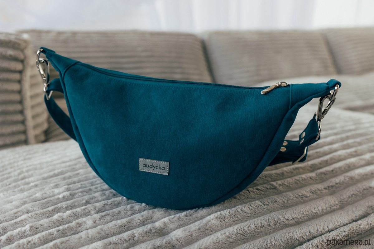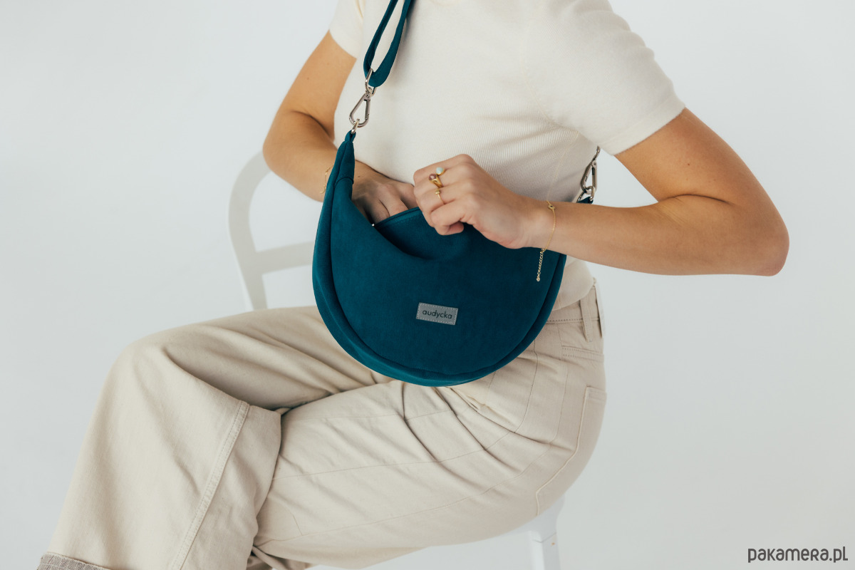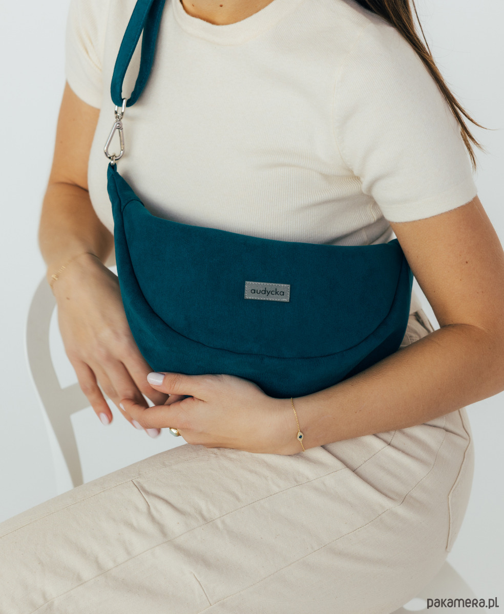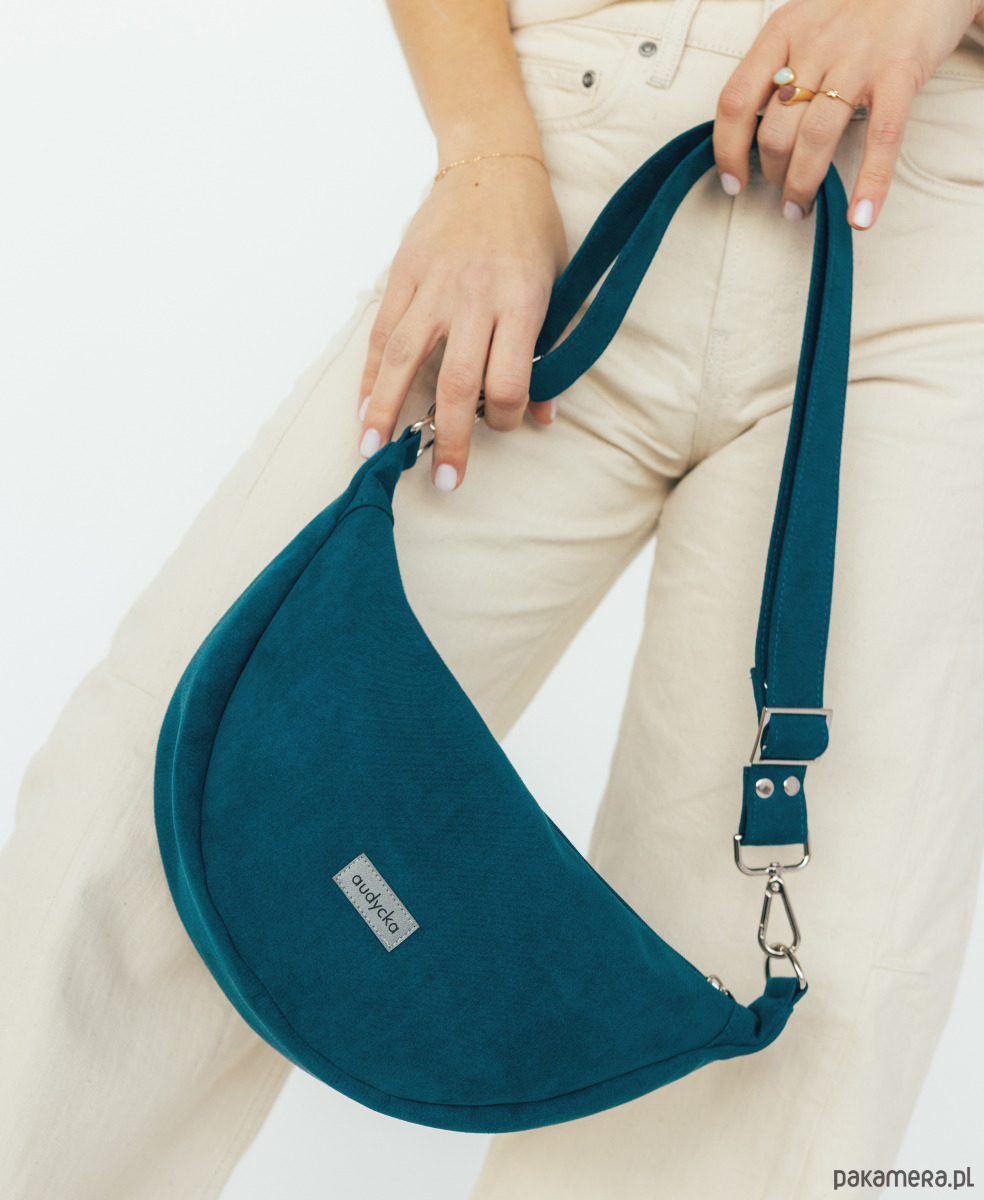 Półokrągła listonoszka w kształcie półksiężyca z nubuku ekologicznego w kolorze turkusowym.