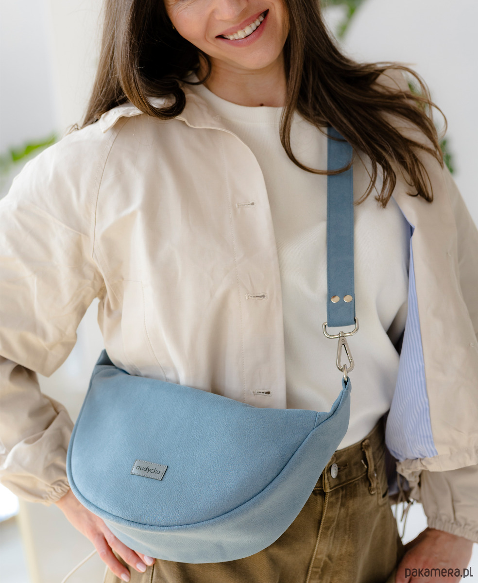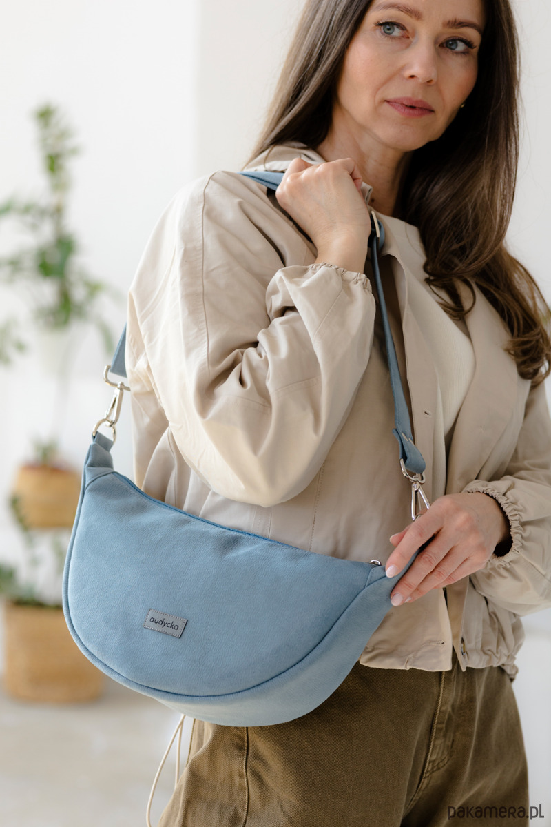 Półokrągła listonoszka w kształcie półksiężyca z nubuku ekologicznego w kolorze baby blue;-).