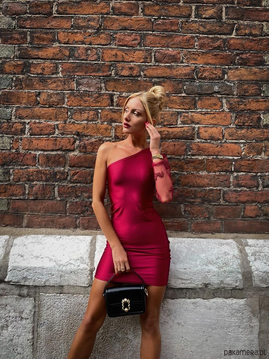 Mini sukienka wykonana z elastycznego materiału. Idealnie dopasowuje się do figury. Model z jednym rękawem. W komplecie długa halka, wykonana z półprzezroczystego materiału z naszytymi zdobieniami o wzorze kwiatowym. Rękaw sukienki mini wykonany został z tego samego materiału co halka.