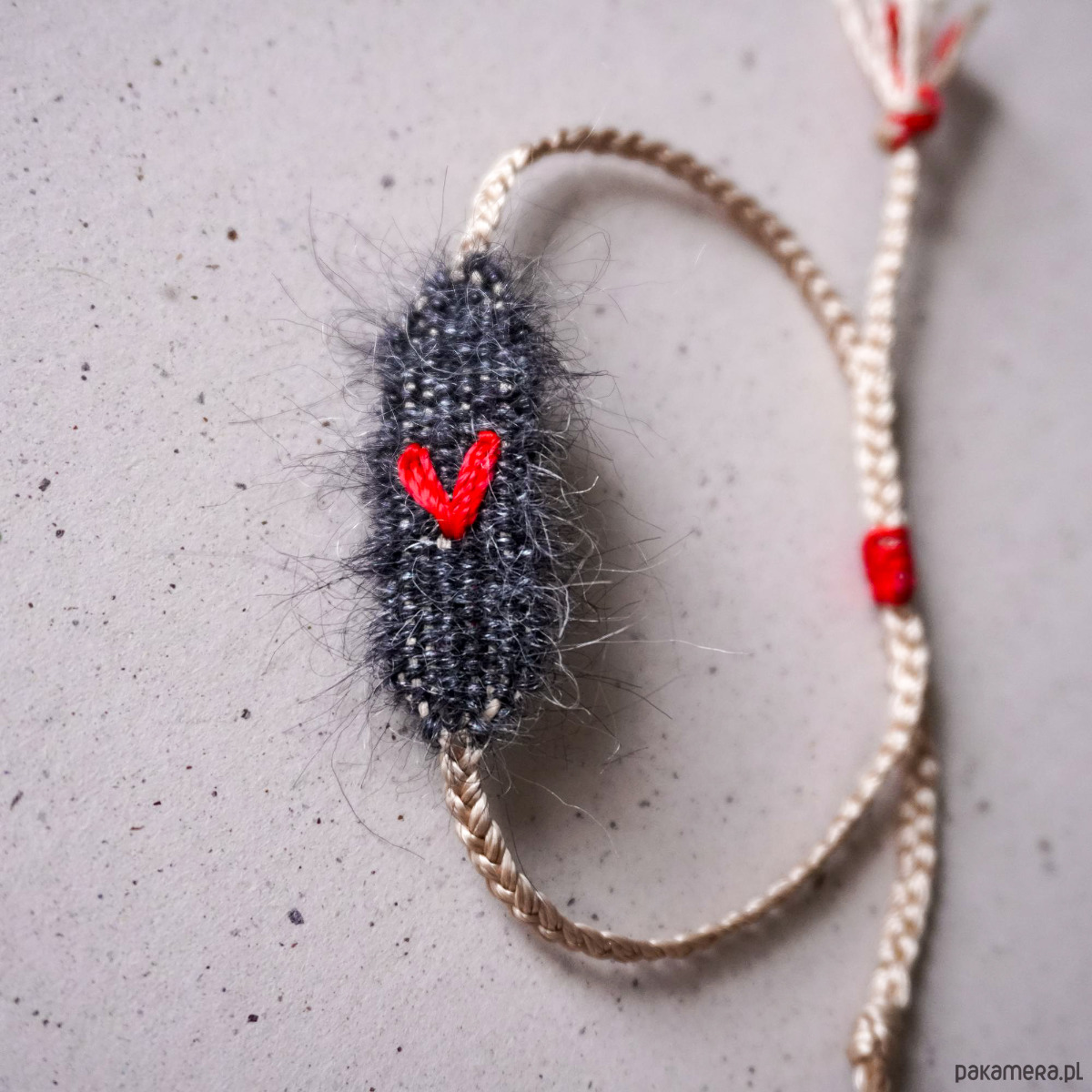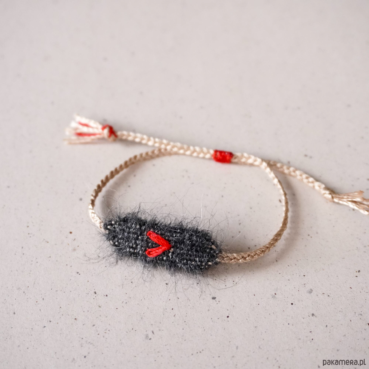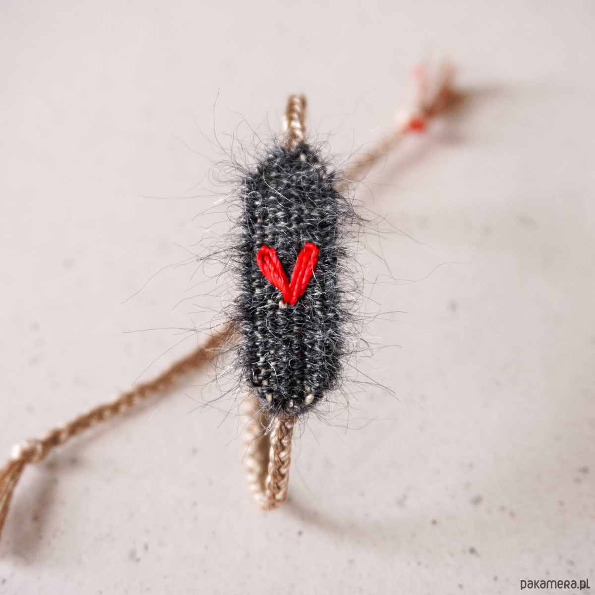 Prześliczna bransoletka tkana ręcznie z haftowanym serduszkiem. Kolor główny to ciemny grafit. Część tkana ma około 3, 4 cm długości, około 1 cm szerokości.
