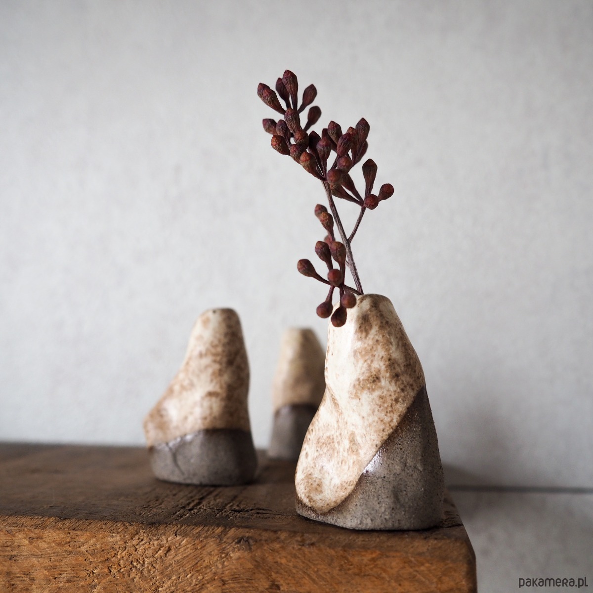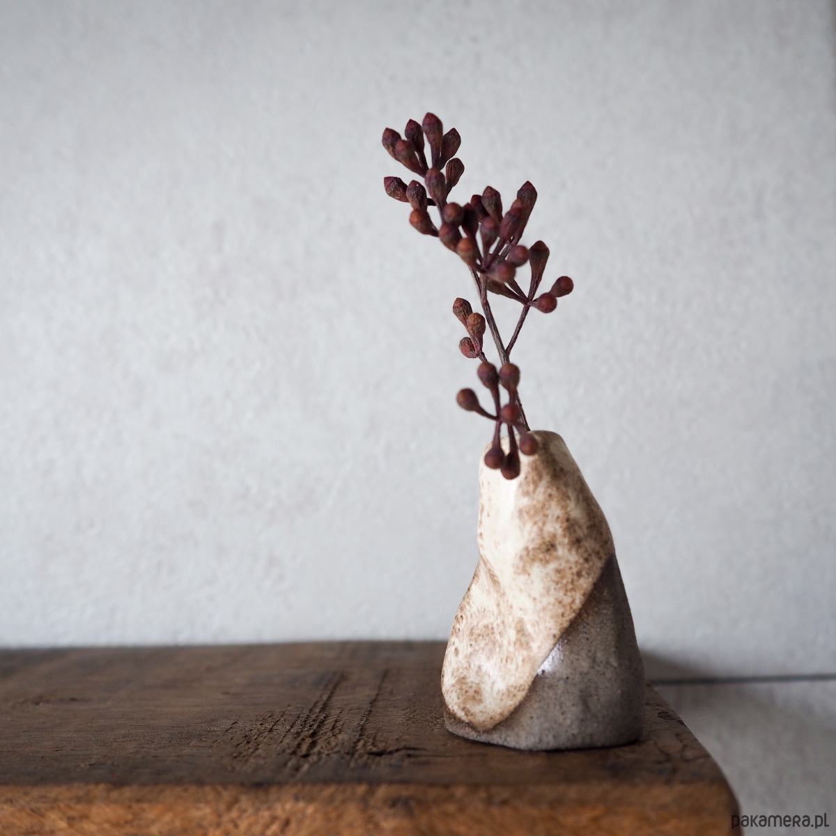 Wazonik stworzony z szarobrązowej gliny, pokryty matowym, beżowym szkliwem.