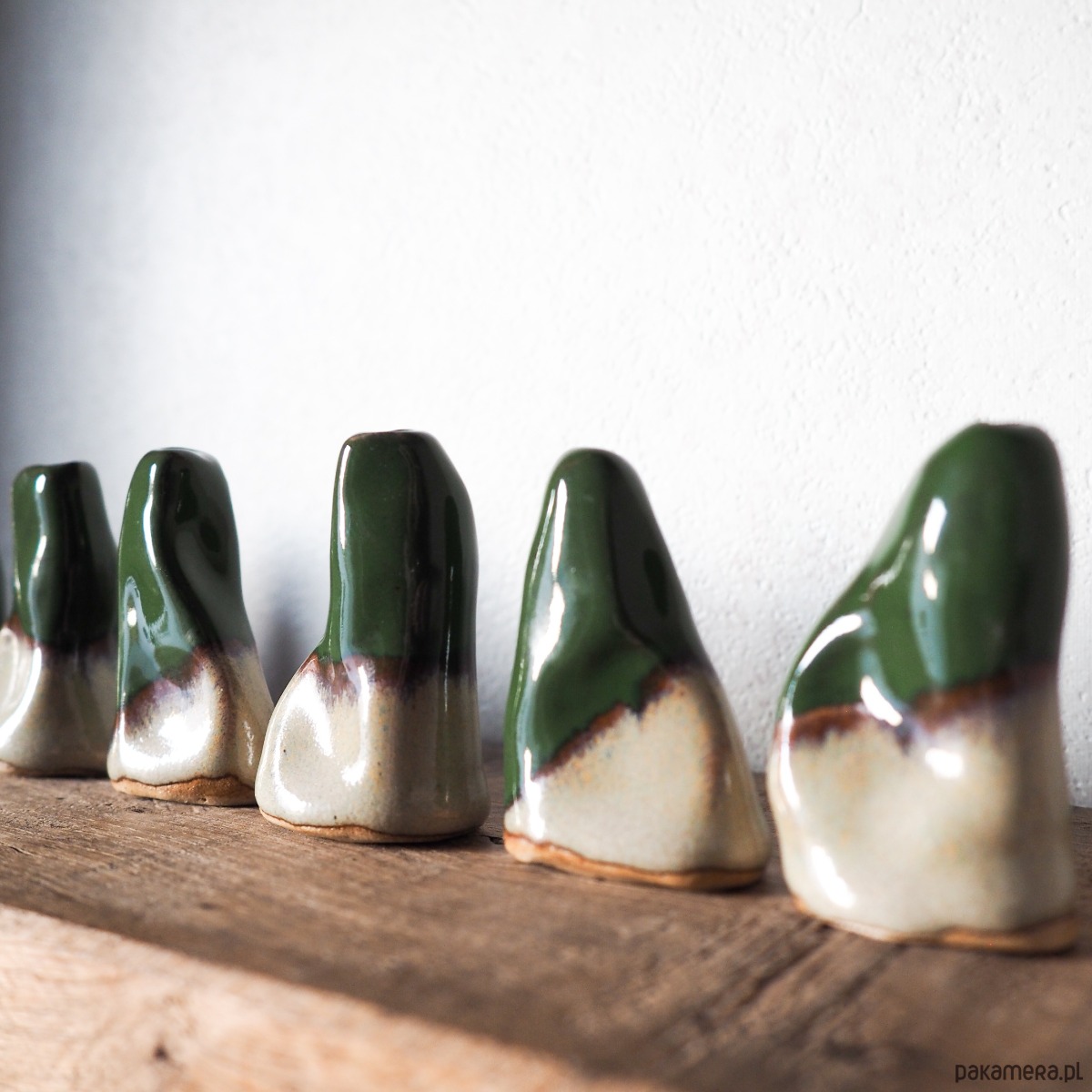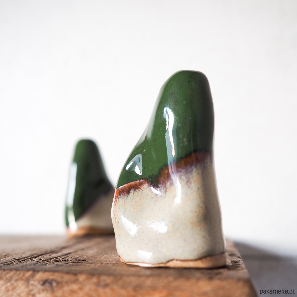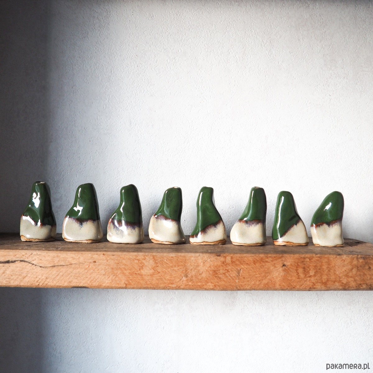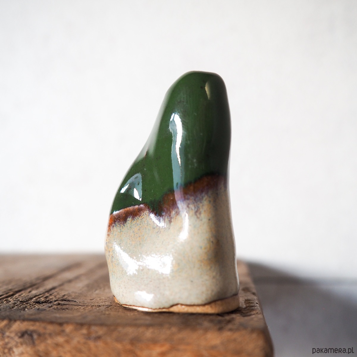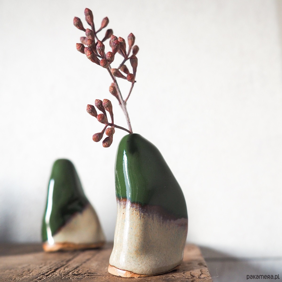 Niewielki, ręcznie tworzony wazonik o organicznej, miękkiej formie, która sprawia, że każdy egzemplarz ma swój indywidualny charakter. Pokryty szkliwem w naturalnych odcieniach zieleni i beżu, przywodzi na myśl krajobrazy i spokojną, ziemistą paletę kolorów.