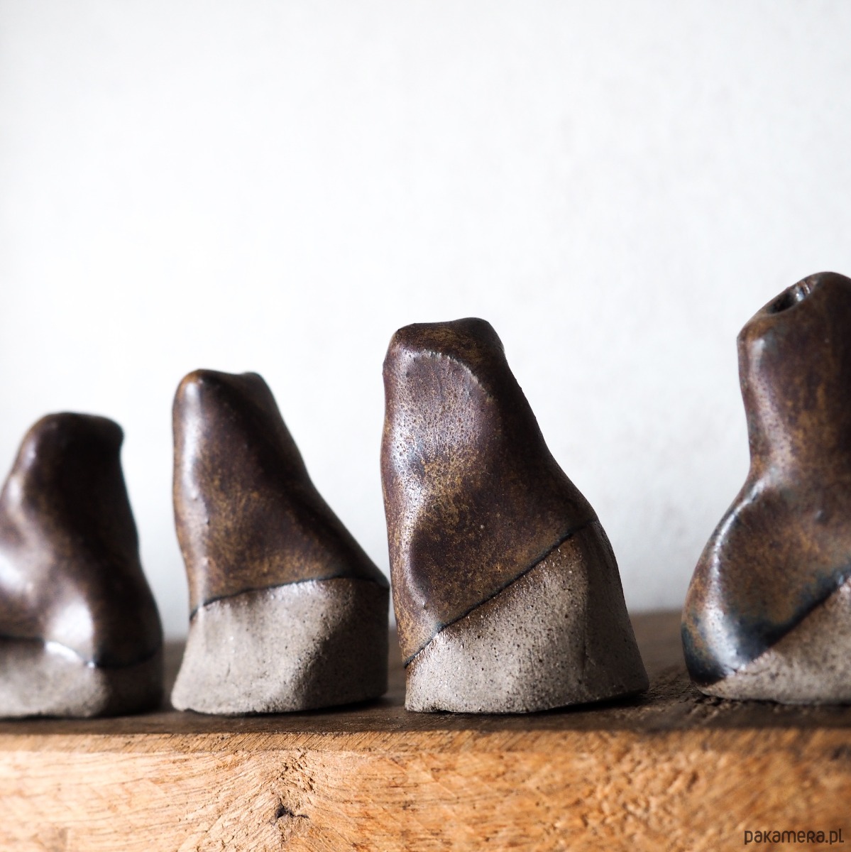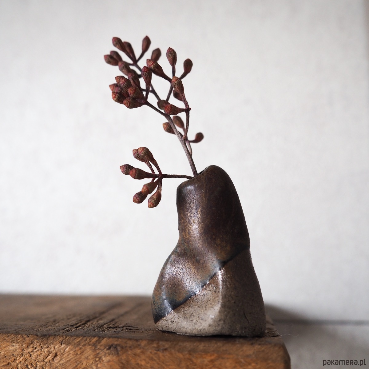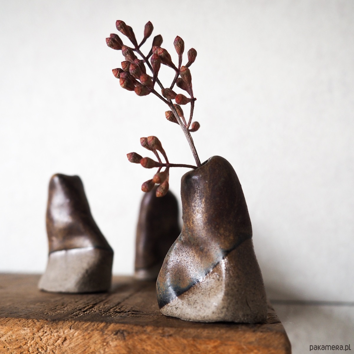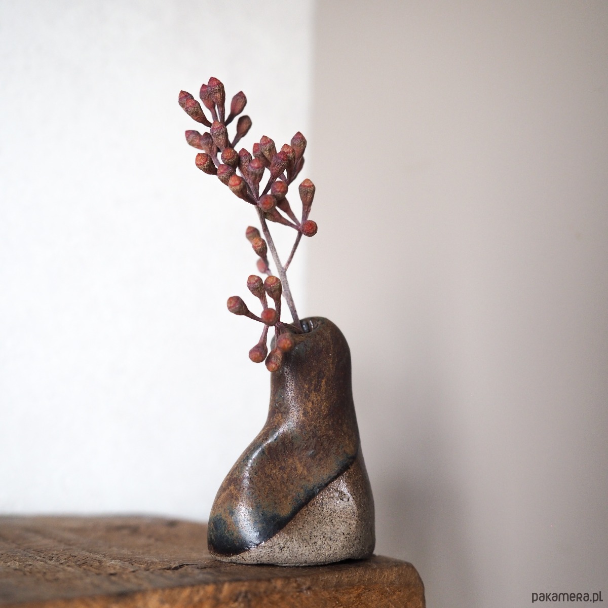 Niewielki, ręcznie tworzony wazonik o organicznej formie, która sprawia, że każdy egzemplarz ma swój indywidualny charakter. Pokryty szkliwem w odcieniach brązu, przywodzi na myśl spokojną, ziemistą paletę kolorów.