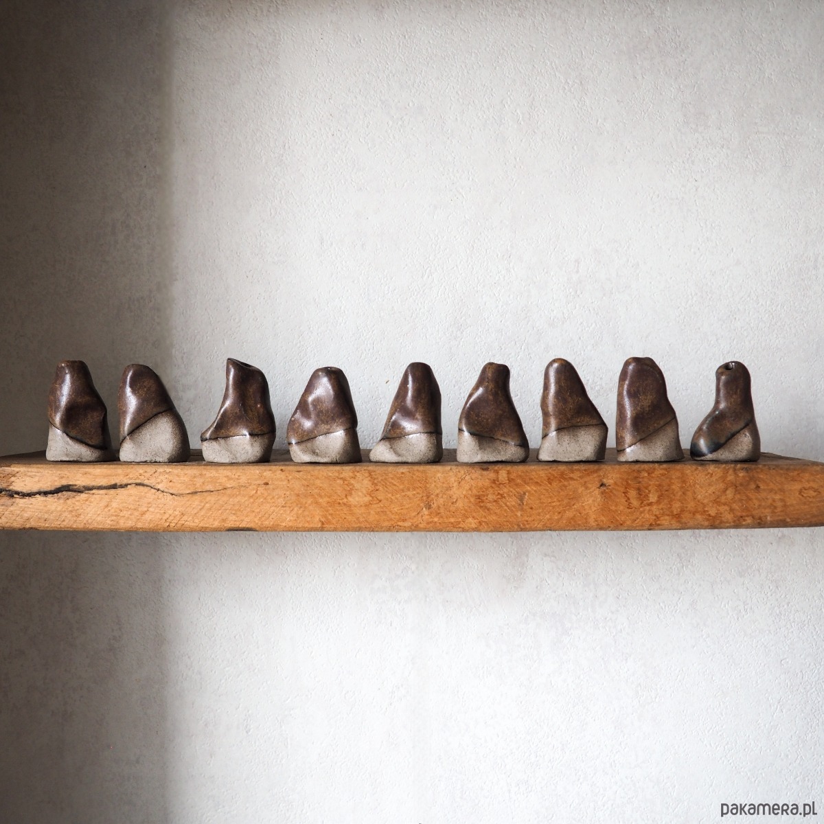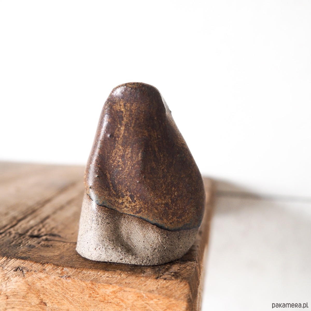 Wazonik stworzony z szarobrązowej gliny, pokryty szkliwem w kolorze brązowym.
