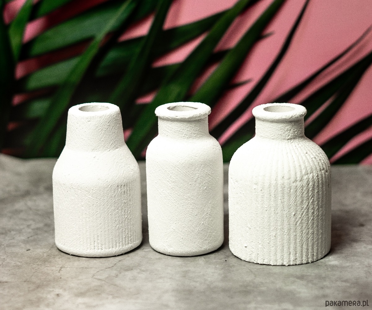 Ręcznie robione mini wazony z gipsu ceramicznego w kolorze białym z efektem surowej ceramiki . Odpowiednie proporcje gipsu i dodatków pozwoliły uzyskać idealny kolor, a zarazem wytrzymałość. Proces obróbki wykonywany jest ręcznie, bez wykorzystania maszyn. Produkt jest zabezpieczony specjalną mieszanką nadającą wytrzymałość, a na samym końcu specjalnym lakierem. Każdy nasz produkt jest inny, nie jest produkowany seryjnie, co nadaje mu niepowtarzalność.