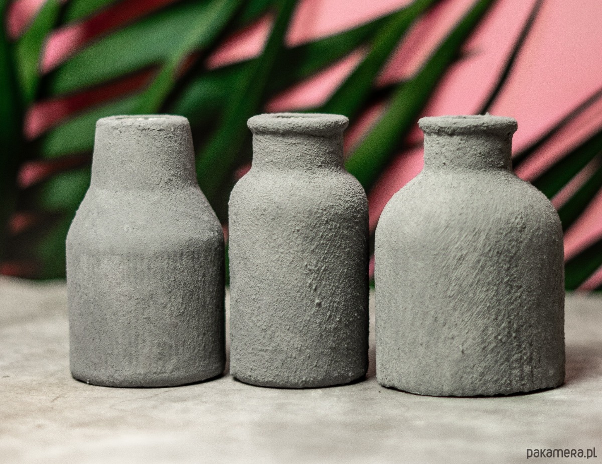 Ręcznie robione mini wazony z gipsu ceramicznego w kolorze szarym z efektem surowej ceramiki. Odpowiednie proporcje gipsu i dodatków pozwoliły uzyskać idealny kolor, a zarazem wytrzymałość. Proces obróbki wykonywany jest ręcznie, bez wykorzystania maszyn. Produkt jest zabezpieczony specjalną mieszanką nadającą wytrzymałość, a na samym końcu specjalnym lakierem. Każdy nasz produkt jest inny, nie jest produkowany seryjnie, co nadaje mu niepowtarzalność.