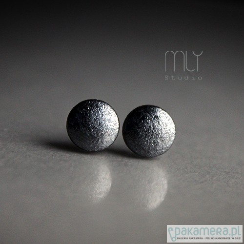 Ceramiczne okrągłe kolczyki w formie sztyftów, ręcznie wykonane z delikatnej czekoladowobrązowej gliny kamionkowej, jednostronnie szkliwione ciemnoszarych srebrzystych szkliw z efektem plamek, na antyalergicznych sztyftach w kolorze srebrnym. Średnica ok. 6mm. Polecam