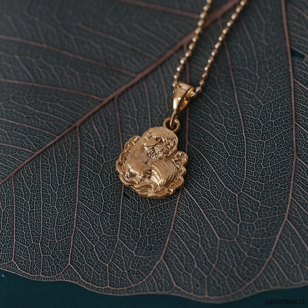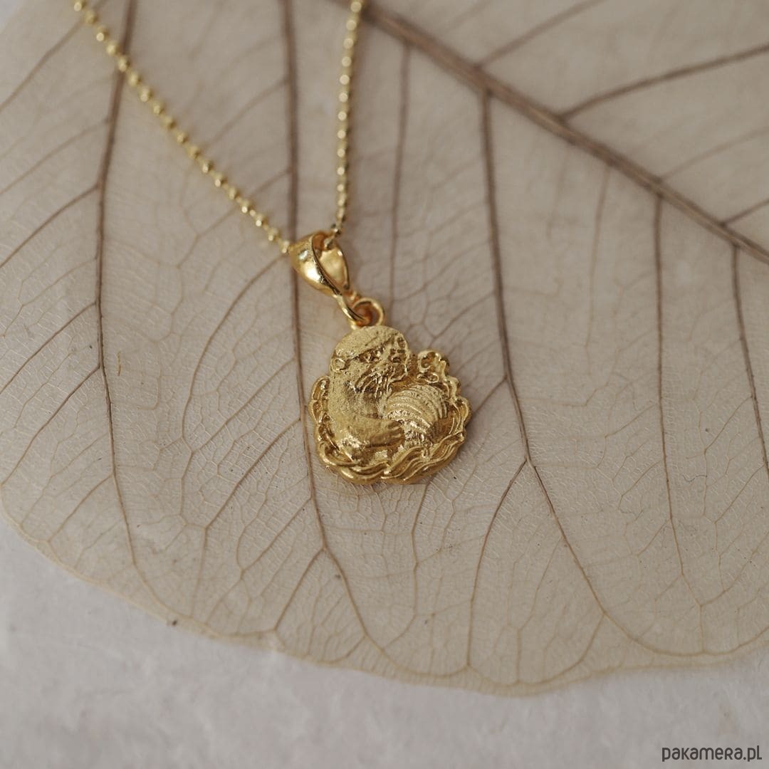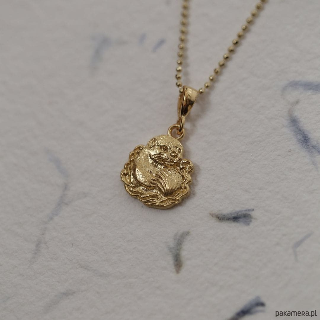 Złocony mini wisiorek z wydrą trzymającą muszelkę.