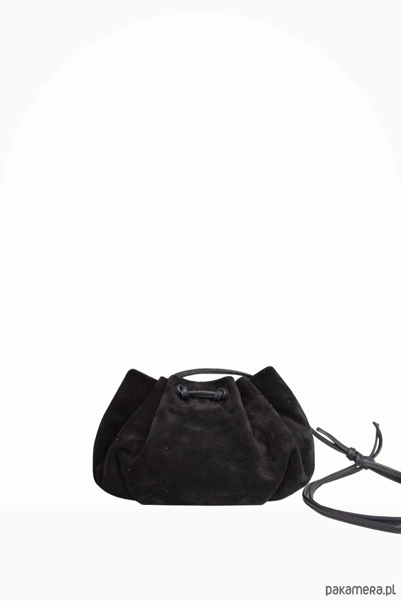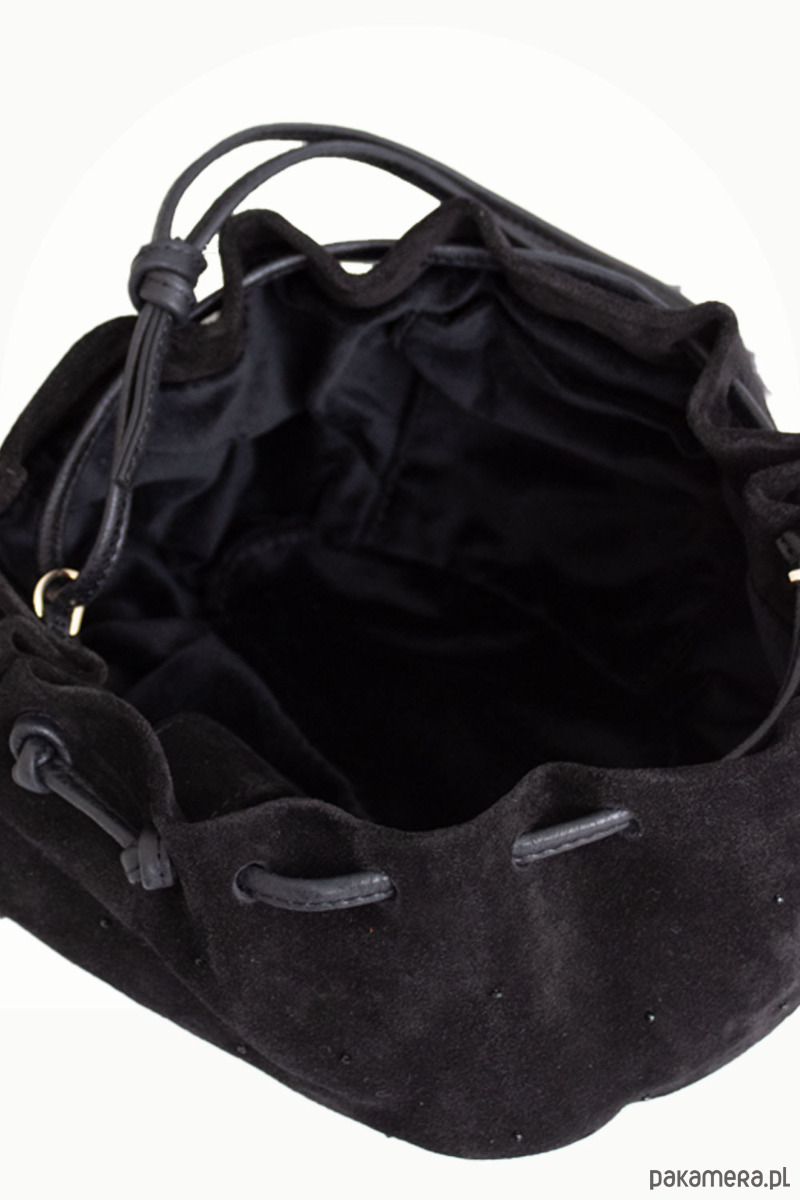 Worek wykonany z naturalnego miękkiego zamszu, wykończony materiałową podszewką. Ręcznie wyszywany czarnym, fasetowanym, połyskującym spinelem. Posiada długą regulowaną rączkę z gładkiej czarnej skóry, można go nosić na jednym pasku lub zrobić podwójne rączki. Zamyka się automatycznie podczas ściągania rączki. W środku i na zewnątrz znajduje się jedna otwarta kieszeń.