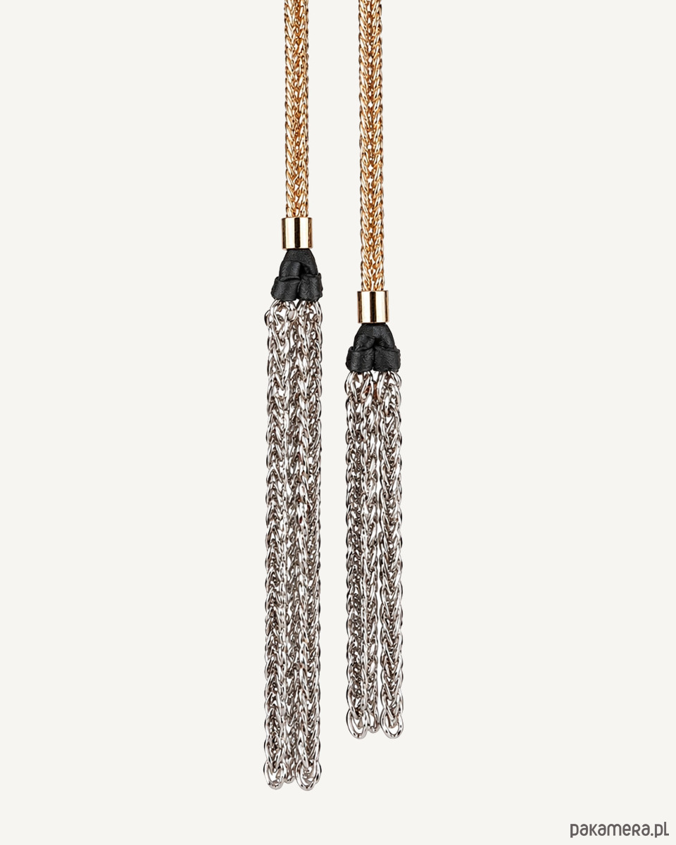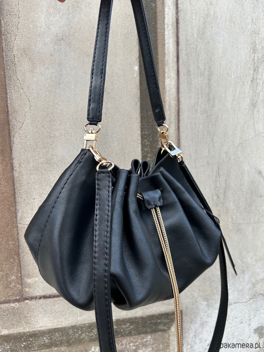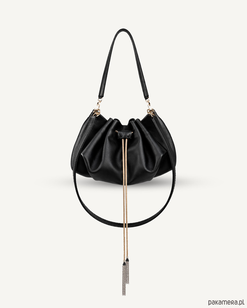 Worek wykonany z naturalnej miękkiej bydlęcej skóry w kolorze czarnym, wykończony wodoodporną materiałową podszewką. W środku znajduje się jedna otwarta kieszeń. Całość ciągana metalowym łańcuchem z metalowymi chwostami na końcach, ozdobionych przeplataną skórą. W zestawie krótka skórzana rączka i pasek na ramię.