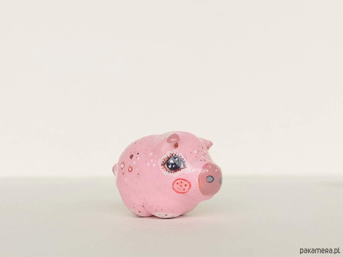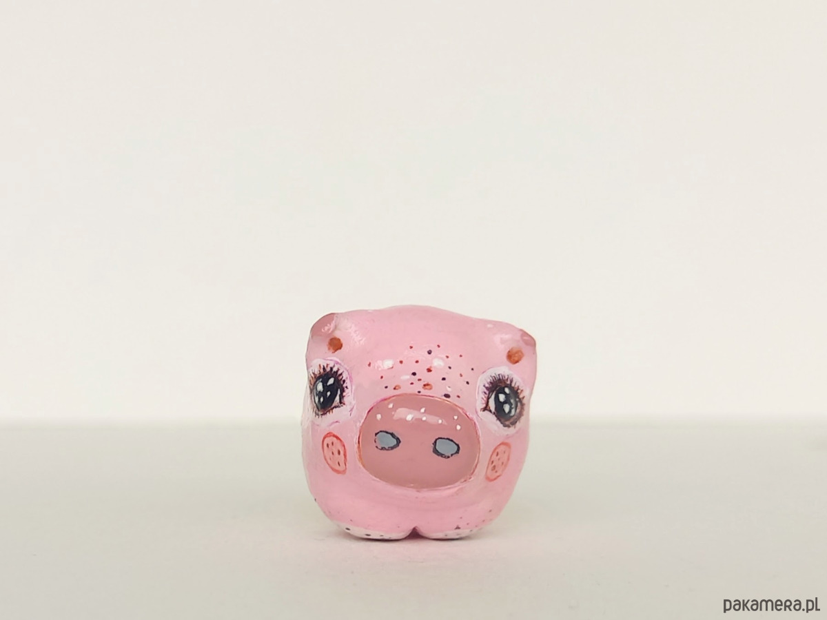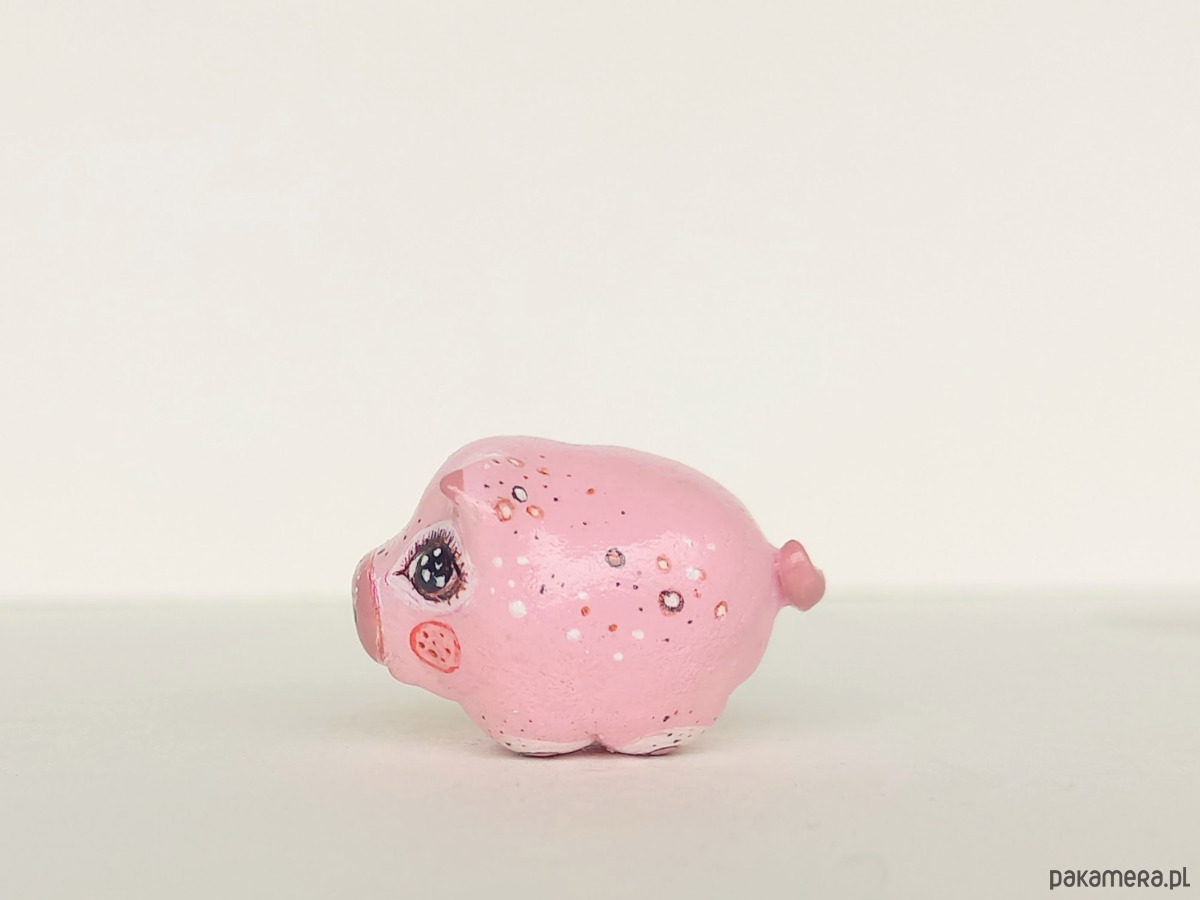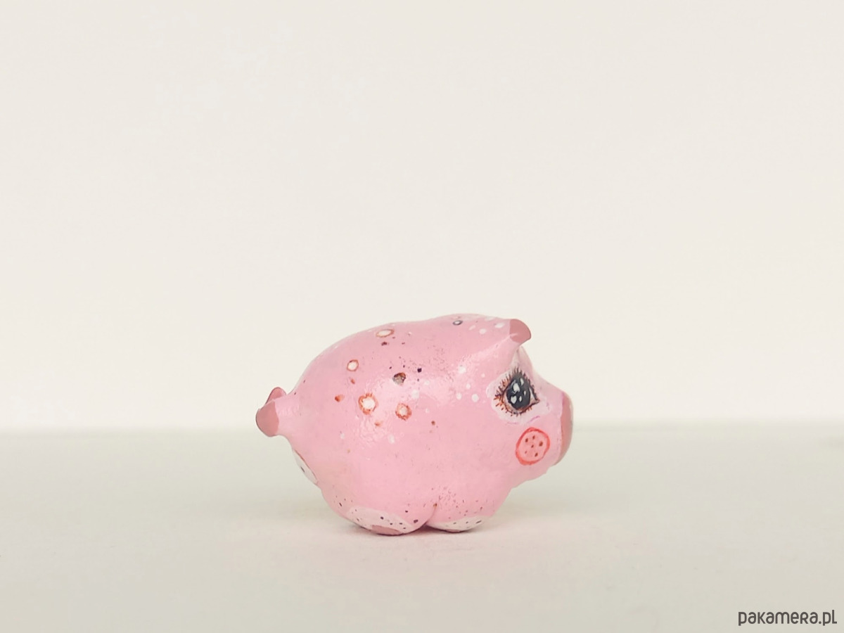 Miniaturowa figurka świnki została wykonana ręcznie z gliny polimerowej, malowana farbami akrylowymi oraz tuszem, następnie pokryta lakierem akrylowym.