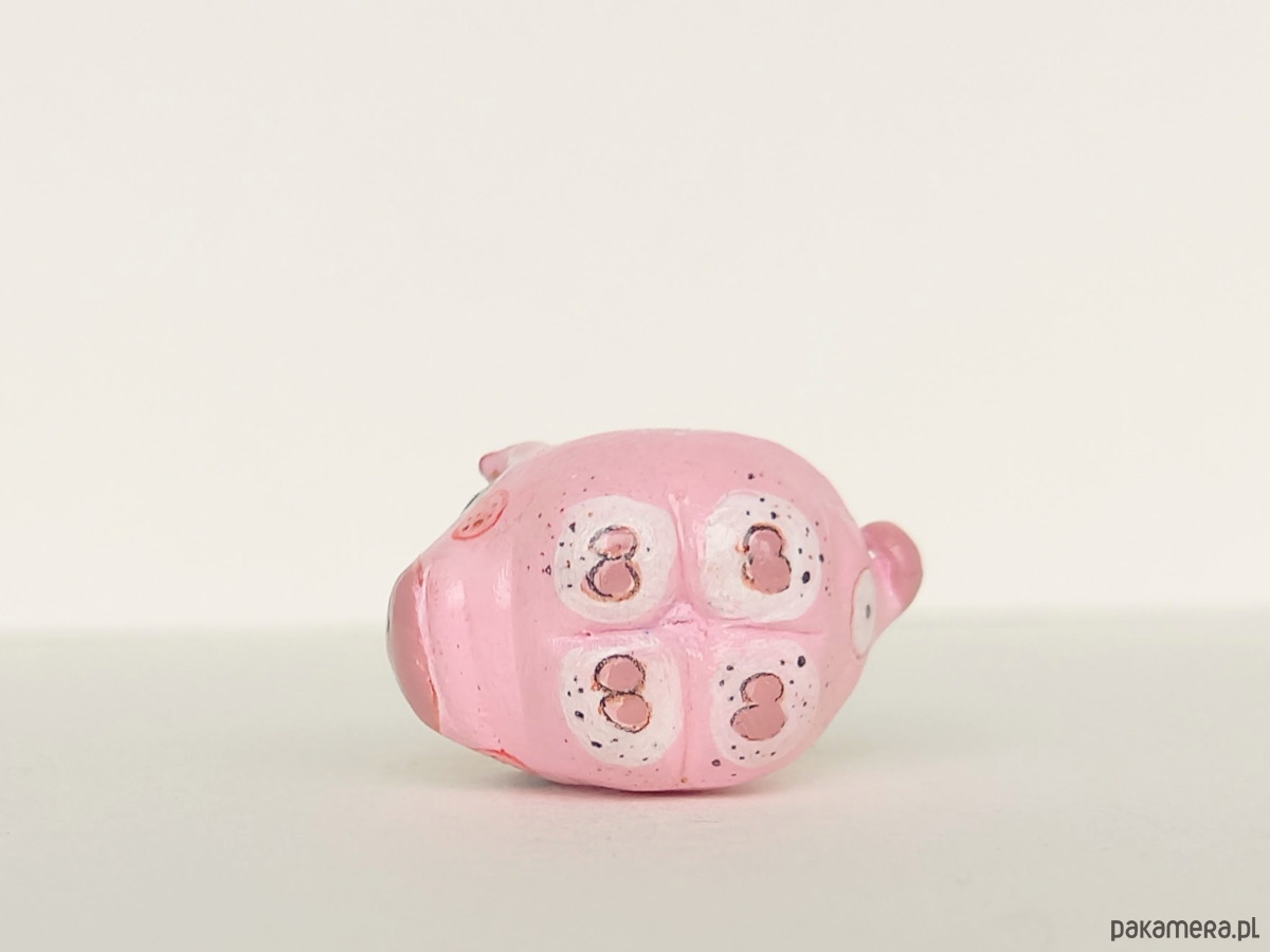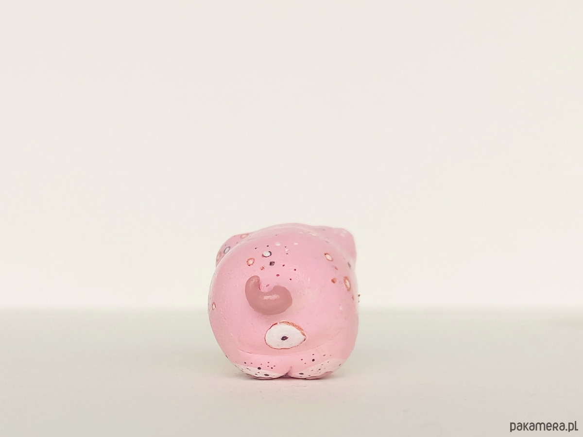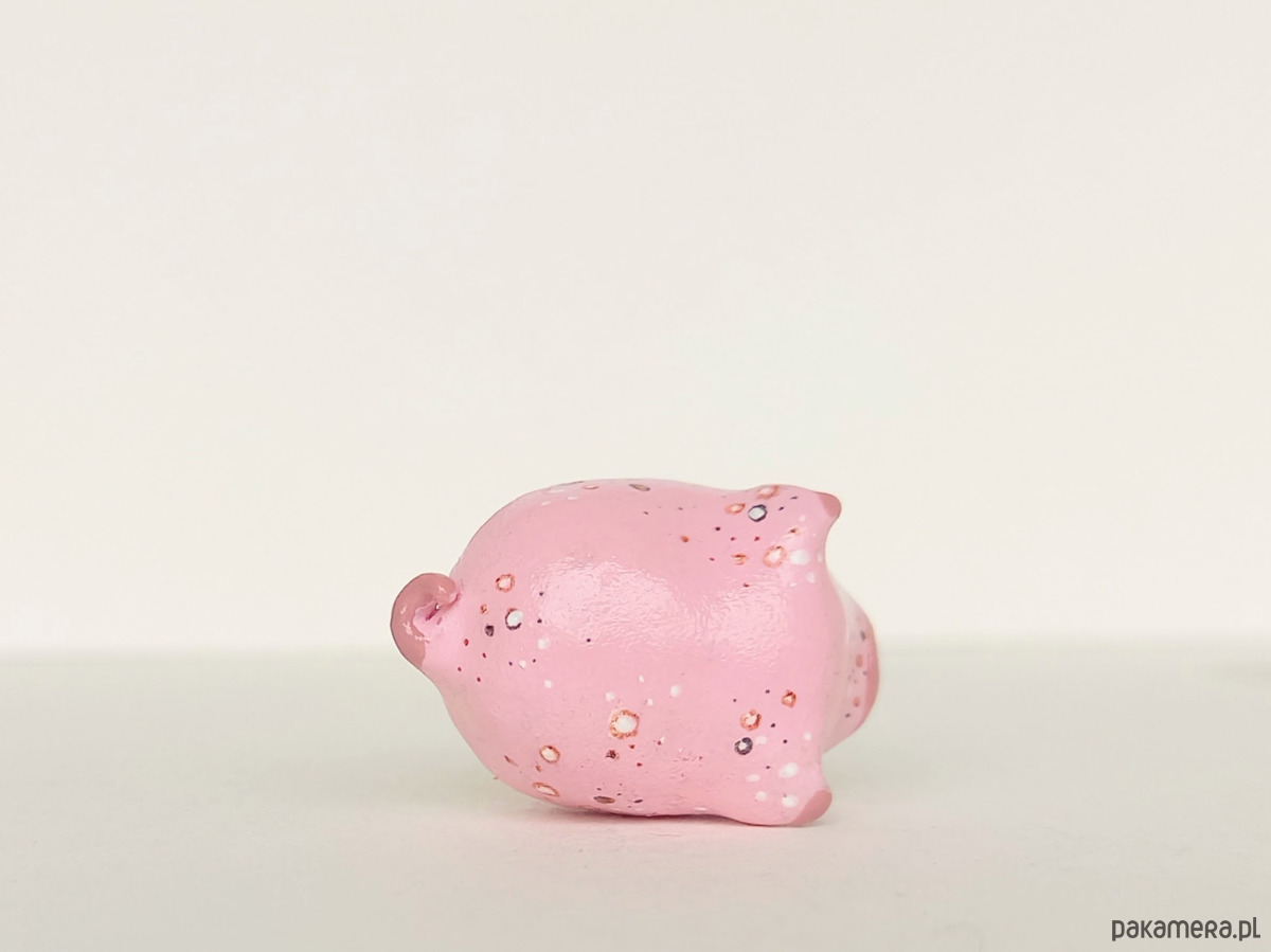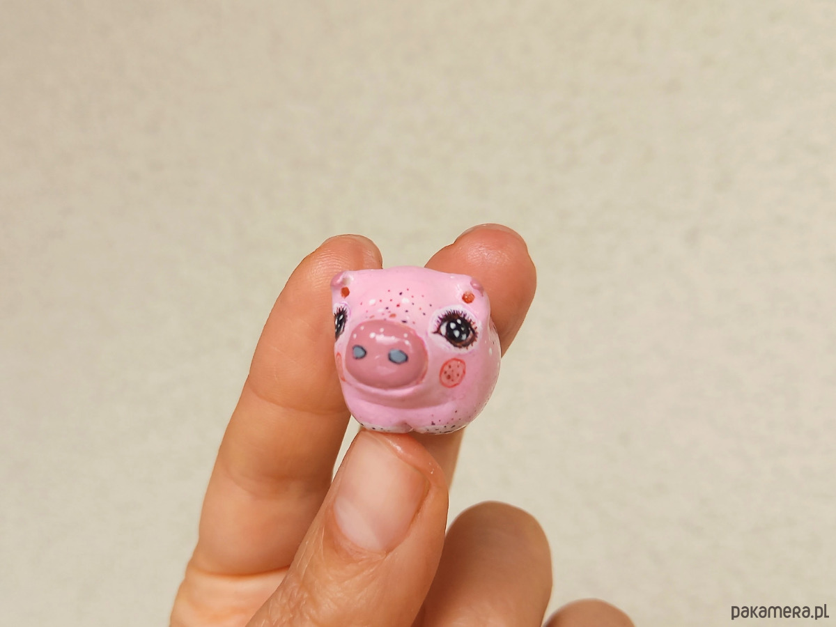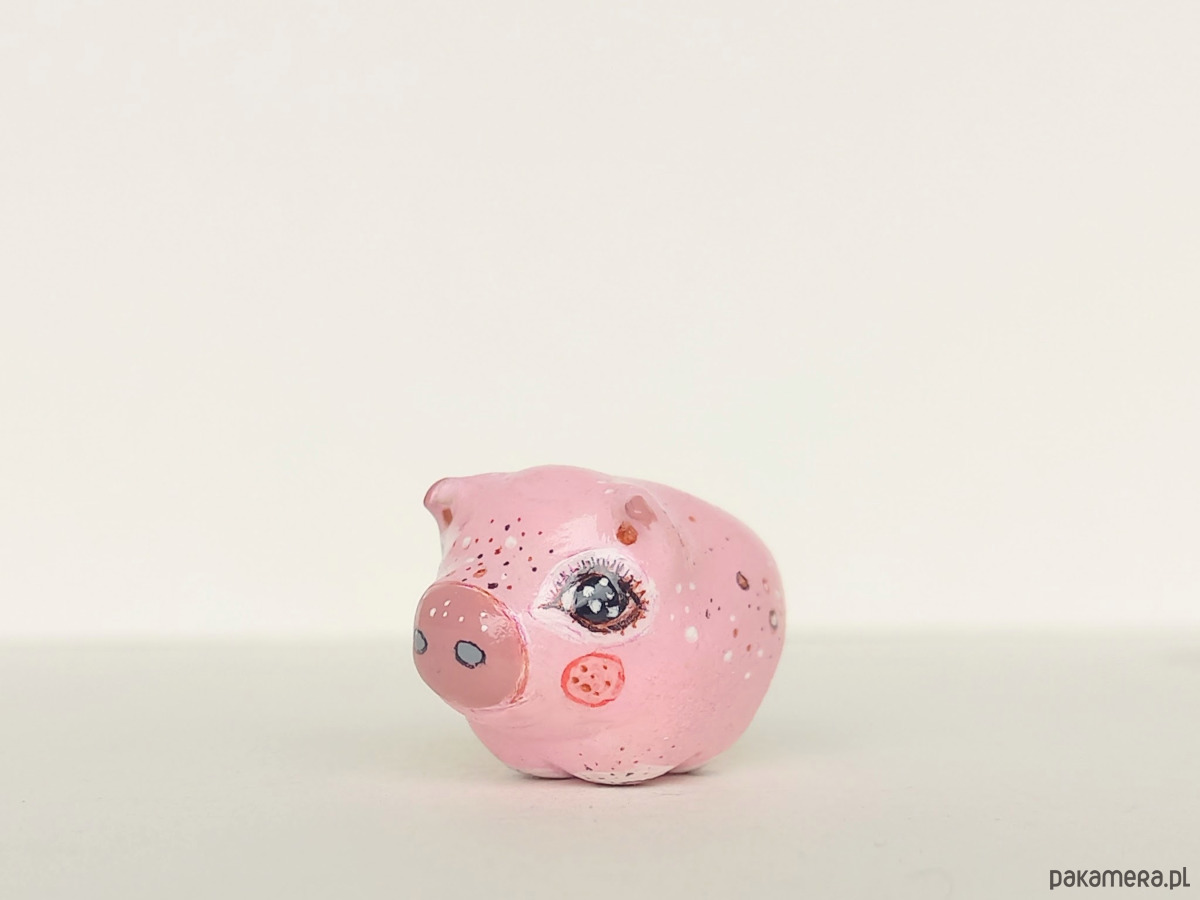 Miniaturowa figurka świnki została wykonana ręcznie z gliny polimerowej, malowana farbami akrylowymi oraz tuszem, następnie pokryta lakierem akrylowym.