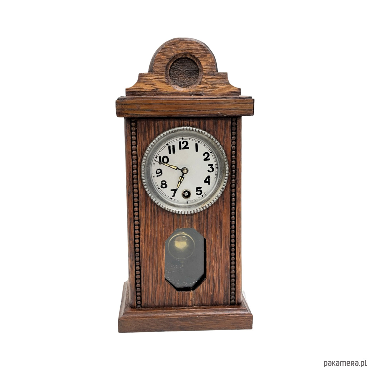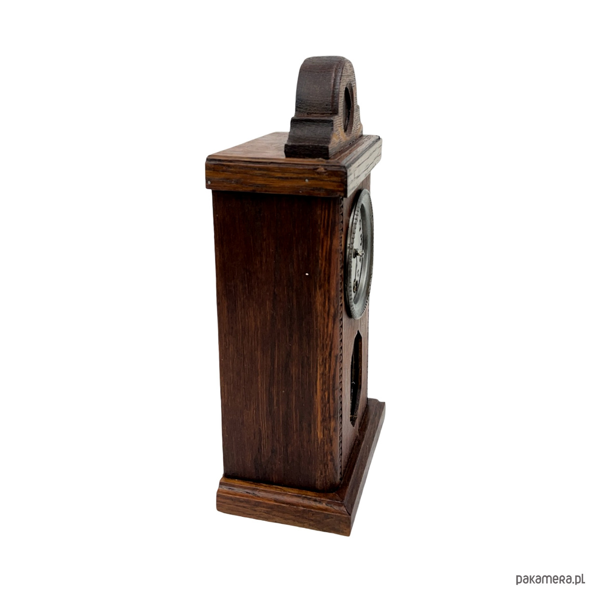 Miniaturowy zegar kominkowy — drewno dębowe w ciemnym wybarwieniu, emaliowana tarcza z czarnymi cyframi arabskimi, obudowa metalowa tarczy niklowana, metalowe wskazówki. Obudowa w formie miniaturowej wieży zegarowej z profilowanym zwieńczeniem arkadowym i otworami resonansowymi, zdobiona rowkowanymi listwami po bokach. Niższy korpus ze szklaną przeszkloną przednią ścianką odsłaniającą ośmiokątne wahadło. Mechanizm nakręcany kluczykiem (z kluczykiem), sprawny. Wymiary: 26 × 13 × 9 cm. Niemcy, lata 20. XX w. Stan dobry.