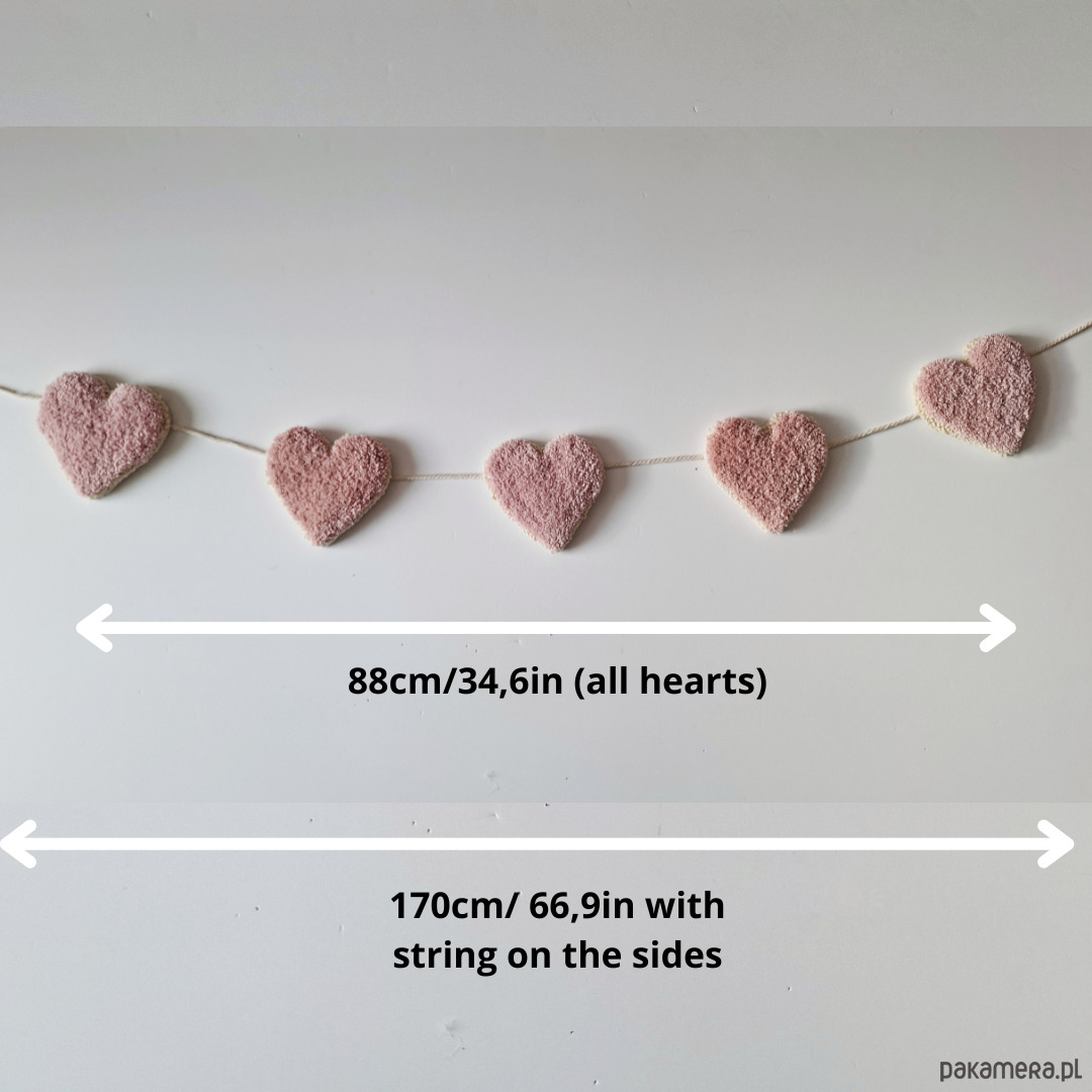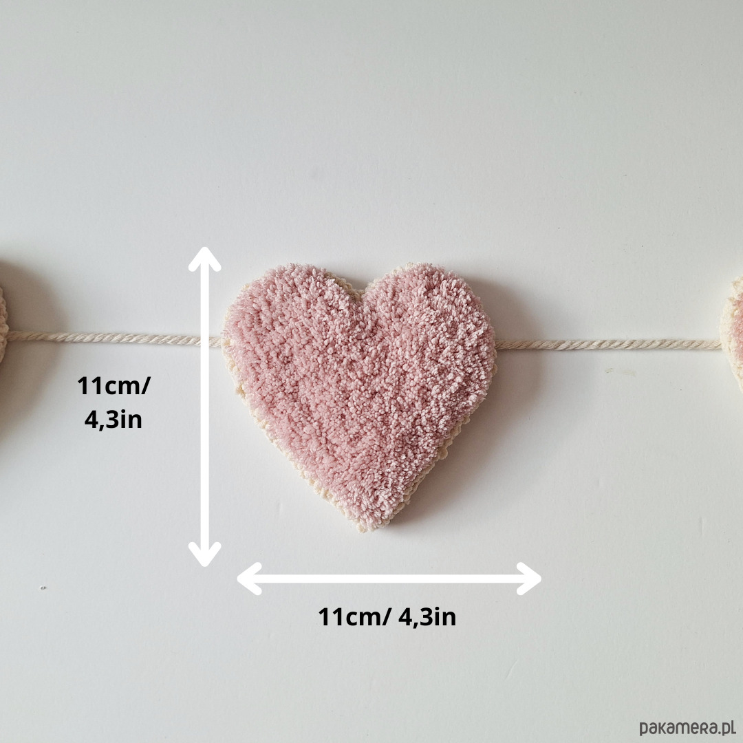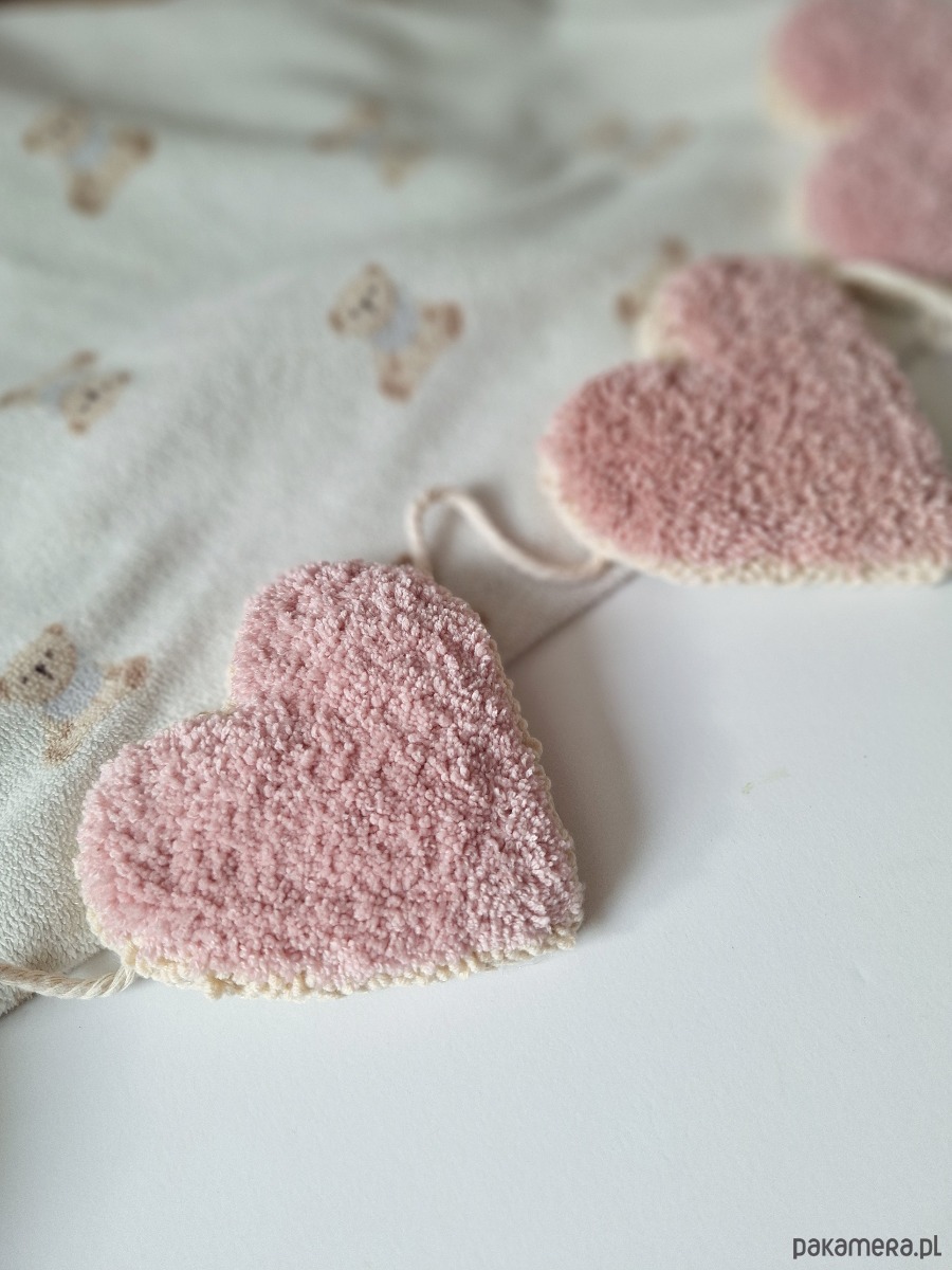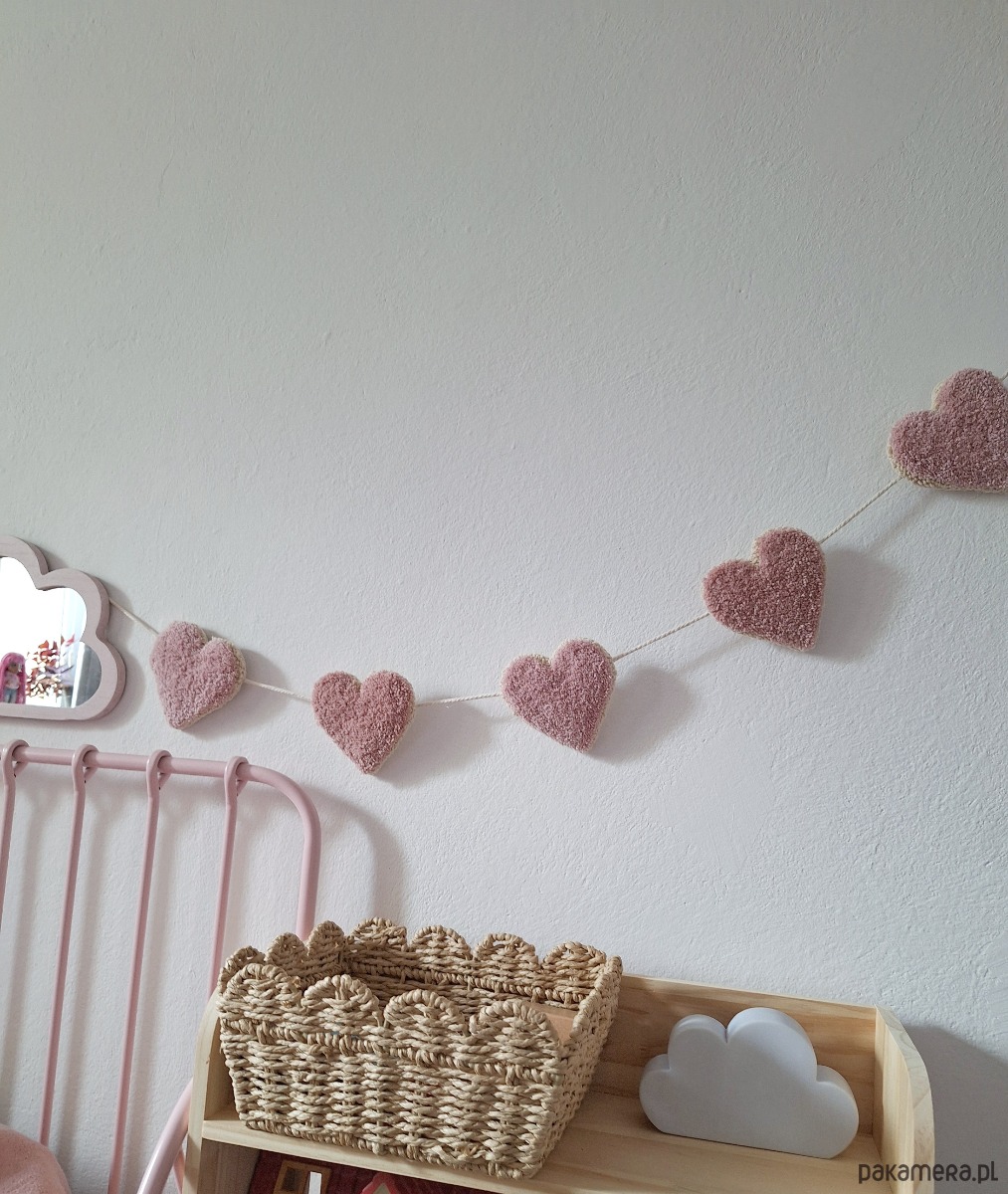 Ta urocza girlanda z sercami to idealna ozdoba do pokoju malucha. Dzięki przytulnej, miękkiej teksturze i neutralnej kolorystyce doskonale wpisuje się w styl boho i skandynawski, tworząc ciepłą i harmonijną atmosferę.