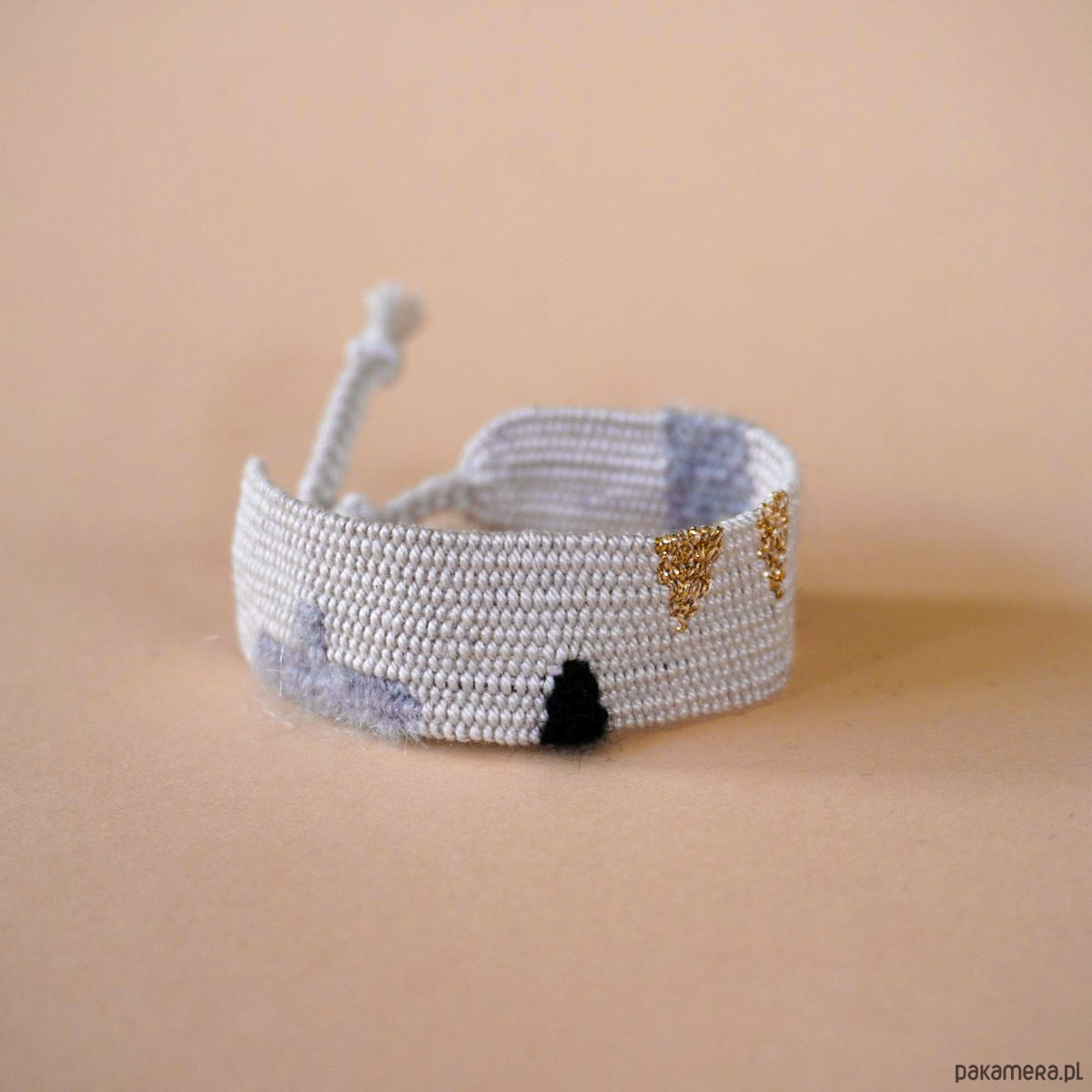 Elegancja i minimalizm w tkanej bransoletce. Szerokość około 2 cm, długość części tkanej około 15 cm. Dochodzą sznureczki do samodzielnego wiązania. Cudo. Polecam serdecznie ♡