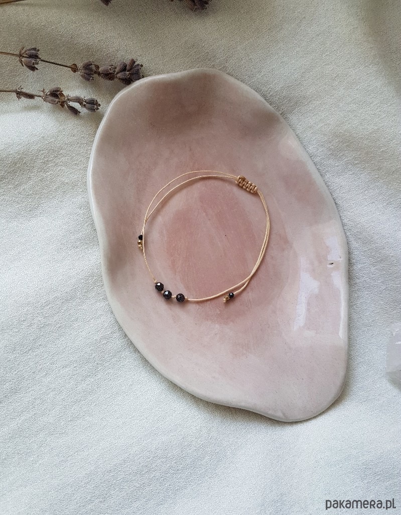 Minimalistyczna ochronna bransoletka z Czarnym Turmalinem na beżowym sznureczku.