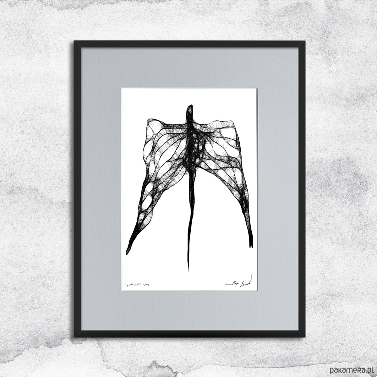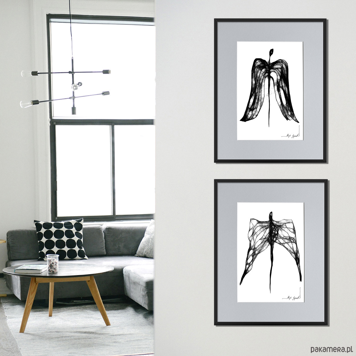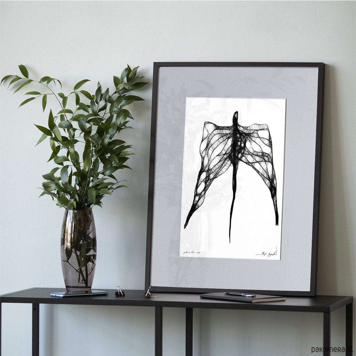 Autorska grafika wykonana techniką mieszaną (giclée, rysunek isografem) na białym, matowym o lekko fakturowanej powierzchni, graficznym papierze Canson 250g. Unikalna kreska wygląda bardzo efektownie, zaś czarno-białe wykończenia wnętrz idealnie wpisują się puste w ściany nowoczesnych, minimalistycznych czy loftowych powierzchni.
