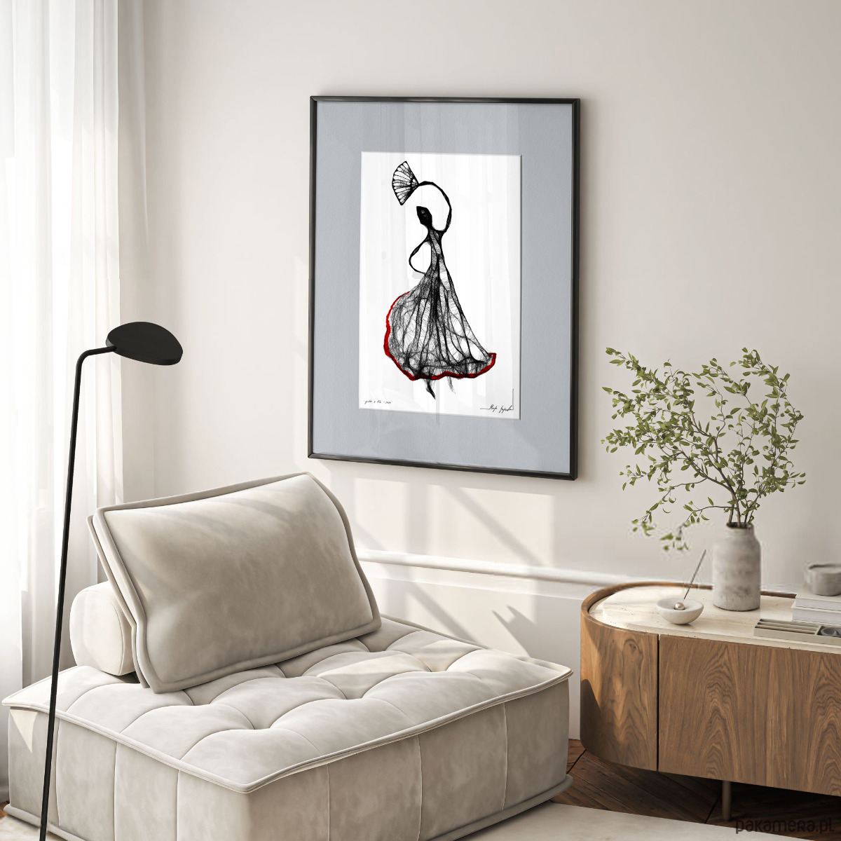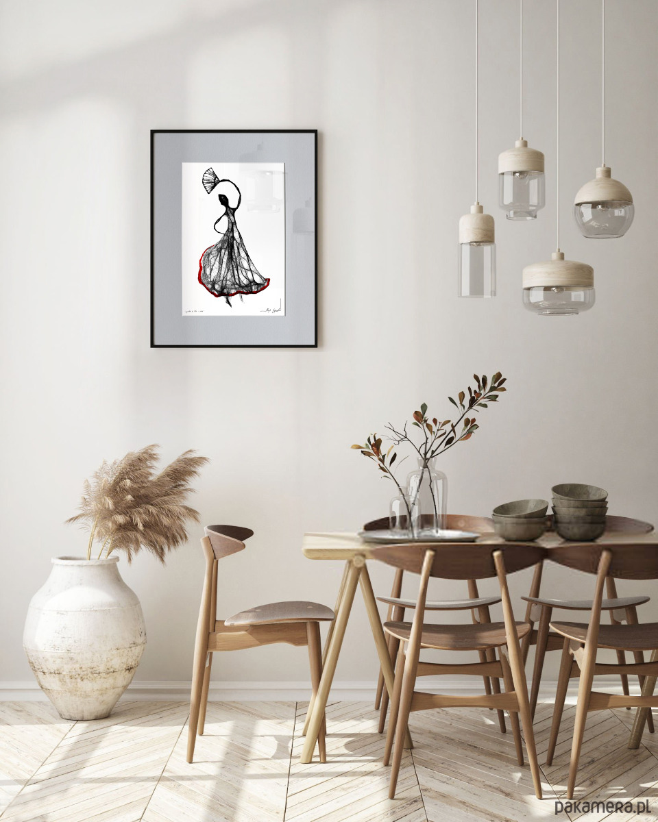 Autorska grafika wykonana techniką mieszaną (giclée, rysunek isografem) na białym, matowym o lekko fakturowanej powierzchni, graficznym papierze Canson 250g. Unikalna kreska wygląda bardzo efektownie, zaś czarno-białe wykończenia wnętrz idealnie wpisują się puste w ściany nowoczesnych, minimalistycznych czy loftowych powierzchni.