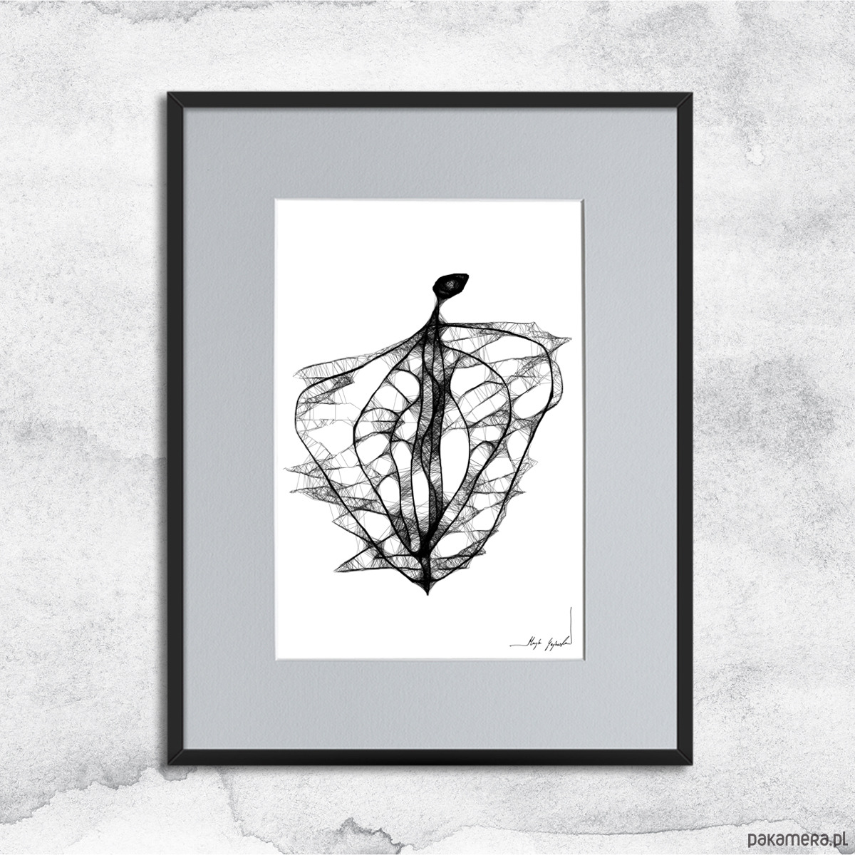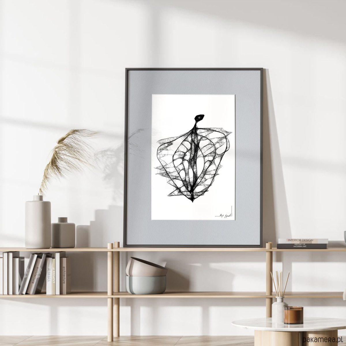 Autorska grafika wykonana techniką mieszaną (giclée, rysunek isografem) na białym, matowym o lekko fakturowanej powierzchni, graficznym papierze Canson 250g. Unikalna kreska wygląda bardzo efektownie, zaś czarno-białe wykończenia wnętrz idealnie wpisują się puste w ściany nowoczesnych, minimalistycznych czy loftowych powierzchni.