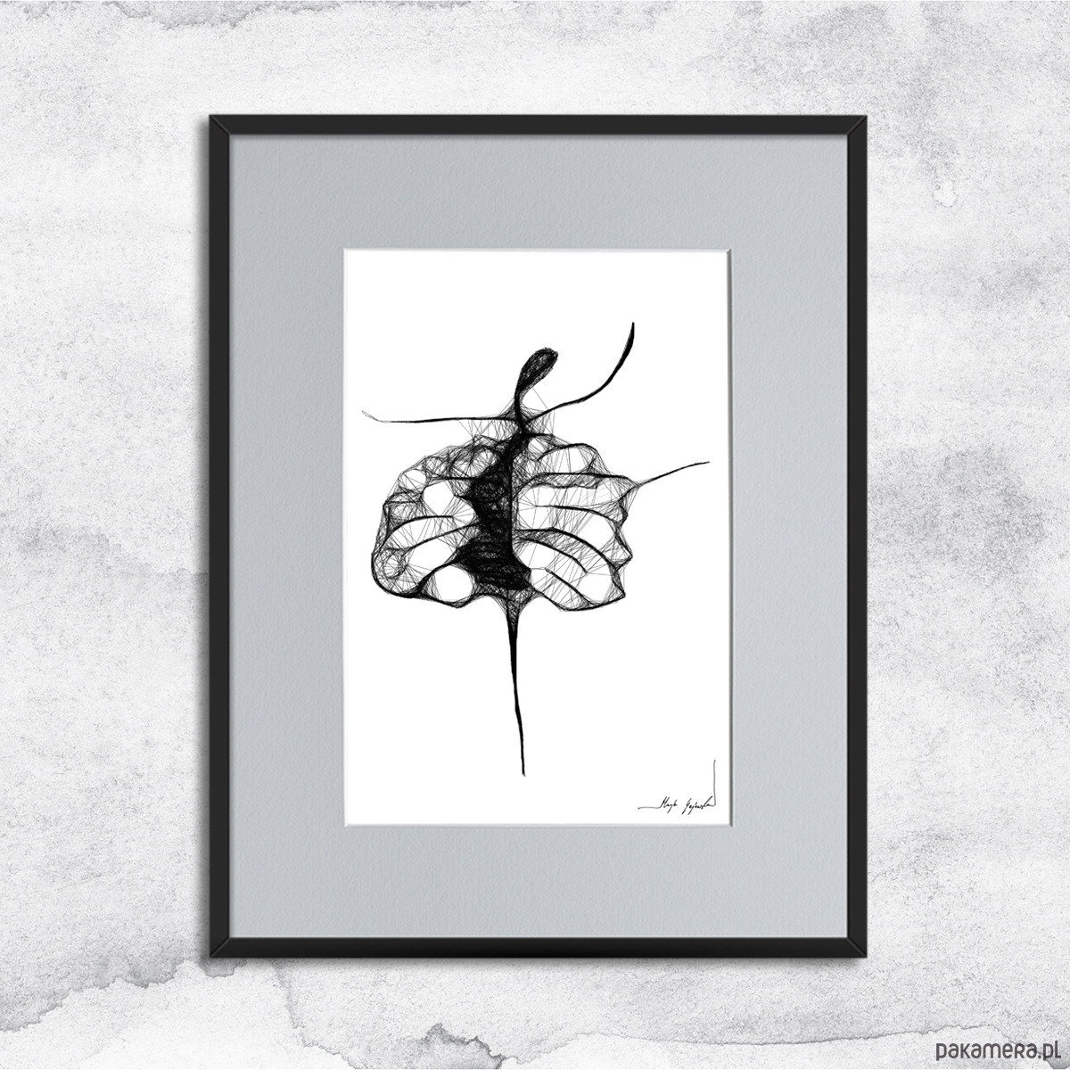 Autorska grafika wykonana techniką mieszaną (giclée rysunek isografem+akwarela) na białym, matowym o lekko fakturowanej powierzchni, graficznym papierze Canson 250g. Unikalna kreska wygląda bardzo efektownie, zaś czarno-białe wykończenia wnętrz idealnie wpisują się puste w ściany nowoczesnych, minimalistycznych czy loftowych powierzchni.
