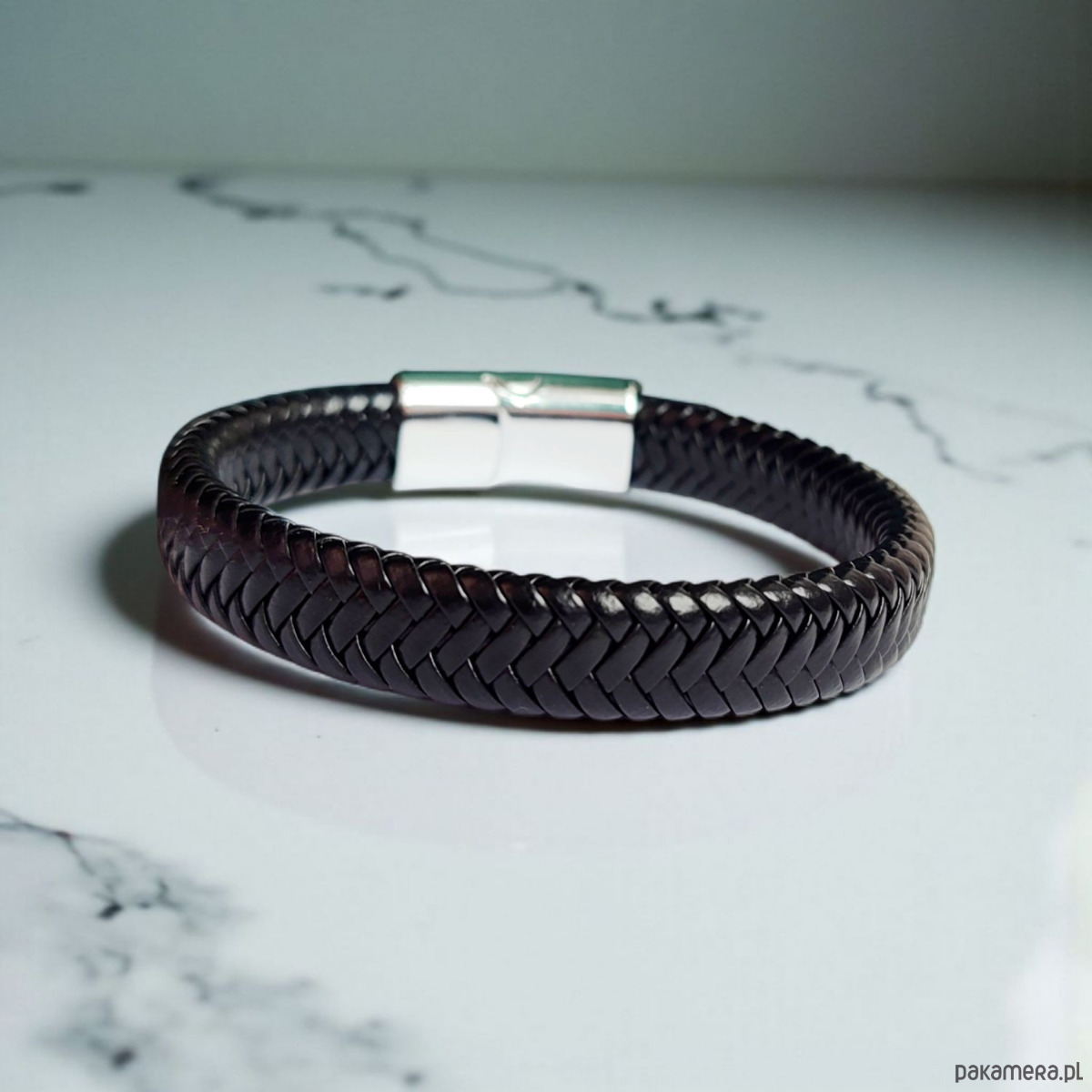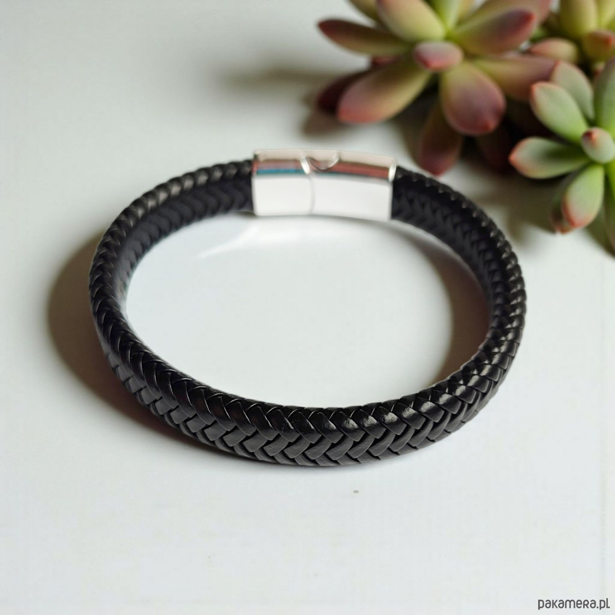 Minimalistyczna bransoletka męska z czarnej ekoskóry, zamykana na magnetyczne zapięcie wykonane ze stali nierdzewnej. Prosty, nowoczesny wygląd sprawia, że stanowi doskonały dodatek do codziennych stylizacji.