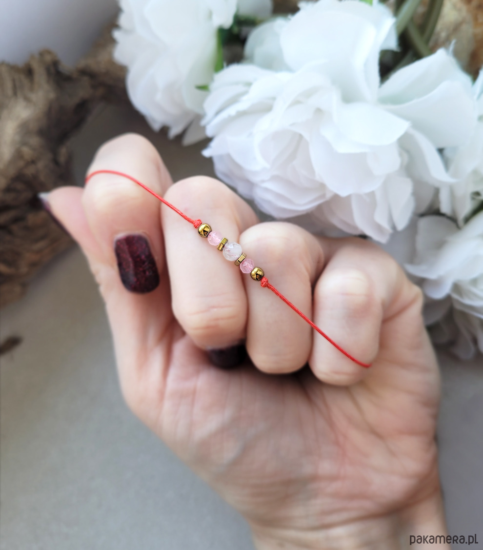 Delikatna minimalistyczna bransoletka zrobiona z kamieni naturalnych: Kamienia księżycowego, Kwarcu różowego oraz Hematytu na czerwonym sznurku.