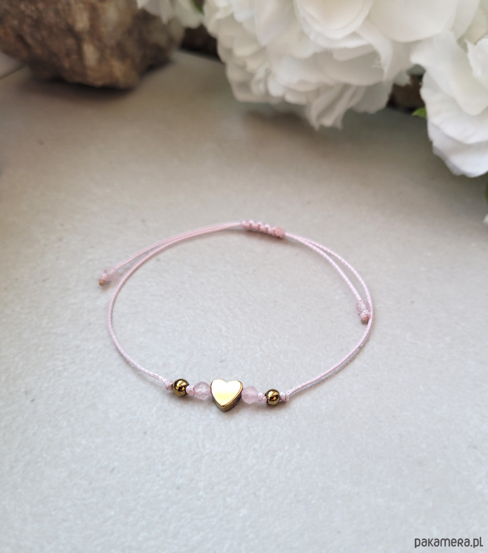 Delikatna minimalistyczna bransoletka zrobiona z kamieni naturalnych: Kwarcu różowego oraz Hematytu z serduszkiem Hematytowym.