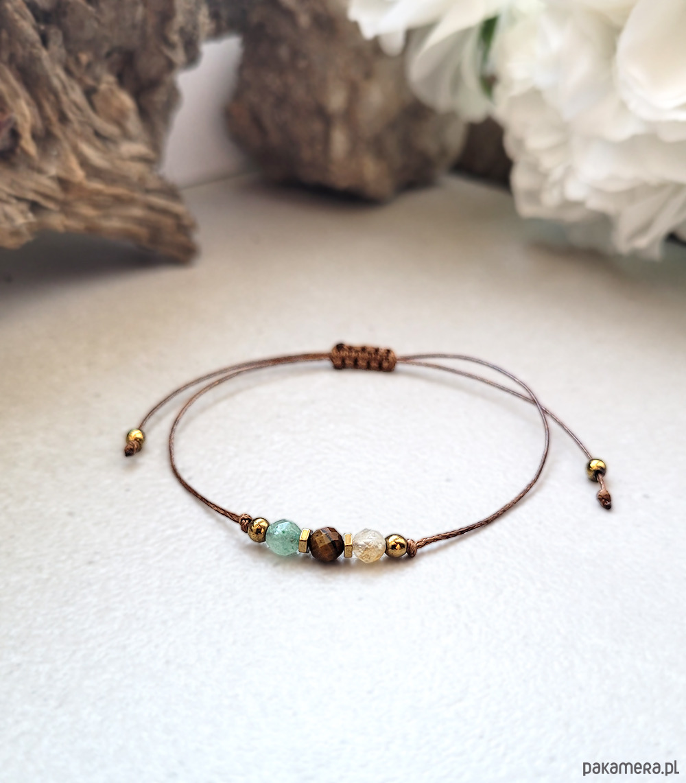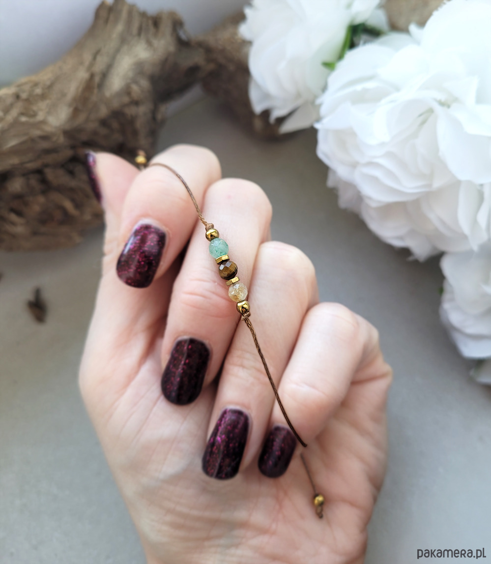 Delikatna minimalistyczna bransoletka zrobiona z kamieni naturalnych: Cytrynu, Tygrysiego oka, Awenturynu oraz Hematytu.