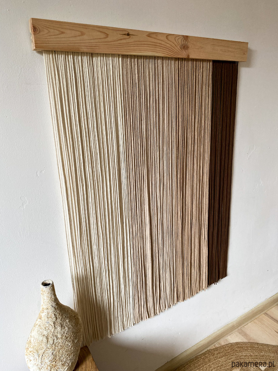 Makrama zawieszona jest na maskownicy z drewna sosnowego. Dzięki wykorzystaniu naturalnych materiałów nasze projekty są nie tylko estetyczne ale również przyjazne dla środowiska. Emanują prostotą i elegancją.