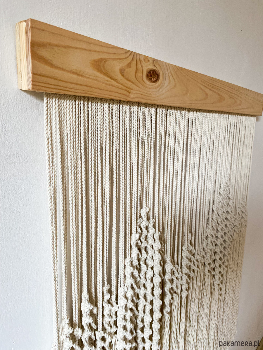 Makrama zawieszona jest na maskownicy z drewna sosnowego. Dzięki wykorzystaniu naturalnych materiałów nasze projekty są nie tylko estetyczne ale również przyjazne dla środowiska. Emanują prostotą i elegancją.
