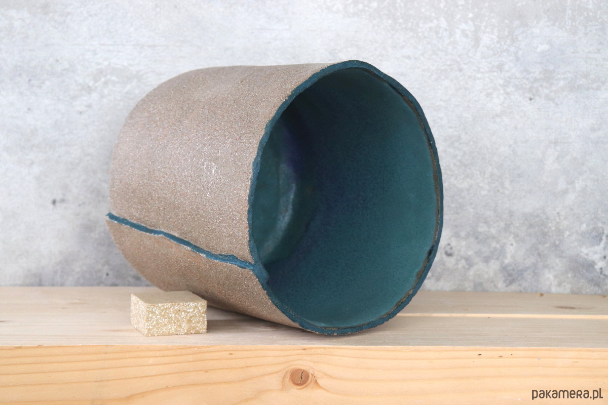 Osłonka wykonana z szarej gliny, pokryta transparentnym i niebieskim szkliwem. Naczynie zostało wykonane ręcznie, bez użycia koła garncarskiego.