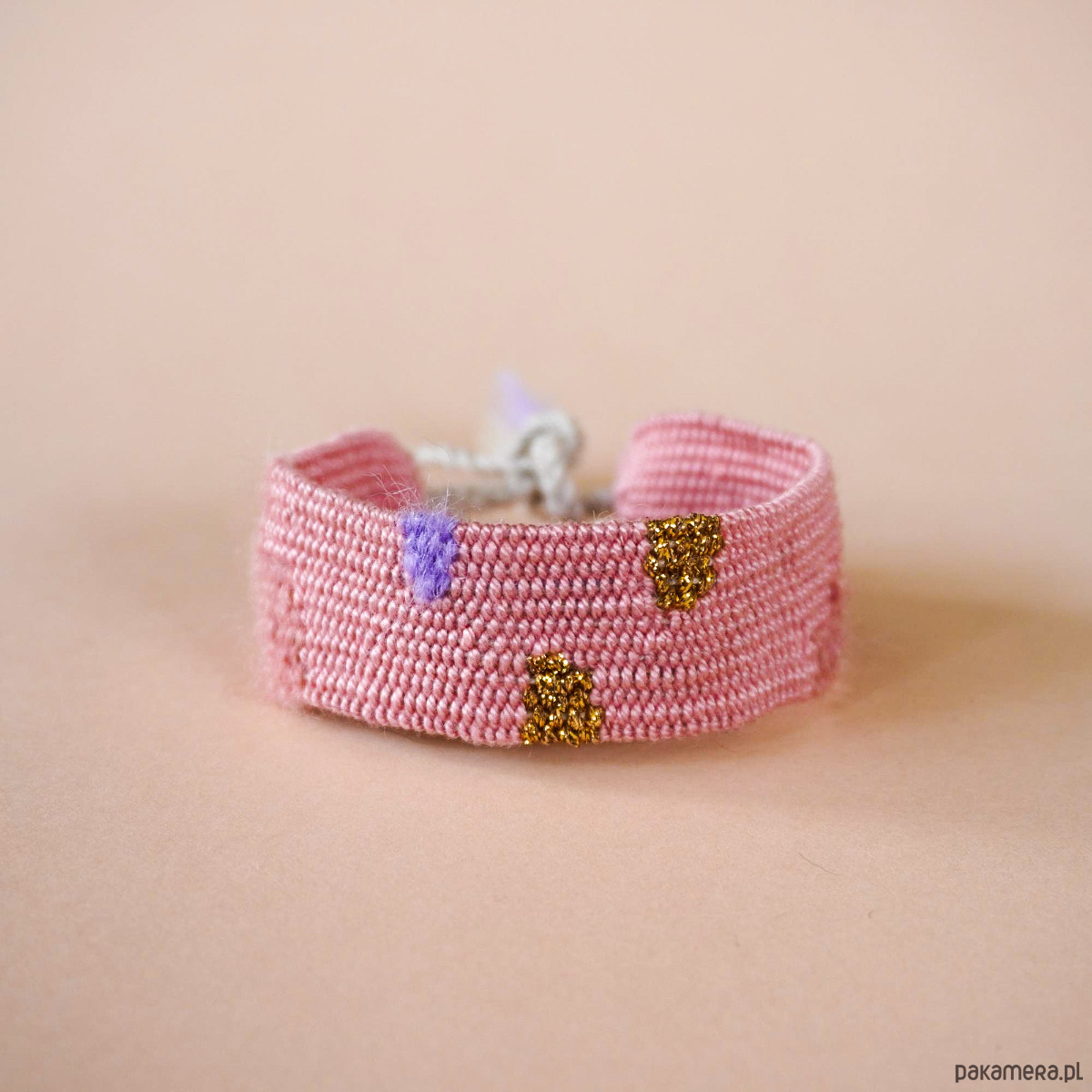 Przepiękna, kobieca, minimalistyczna, absolutnie wyjątkowa bransoletka ręcznie wykonana na krośnie. Odcień różu jest cudowny na żywo. Szerokość około 2 cm, długość części tkanej około 15 cm. Dochodzą sznureczki do samodzielnego wiązania. Cudo. Polecam serdecznie ♡