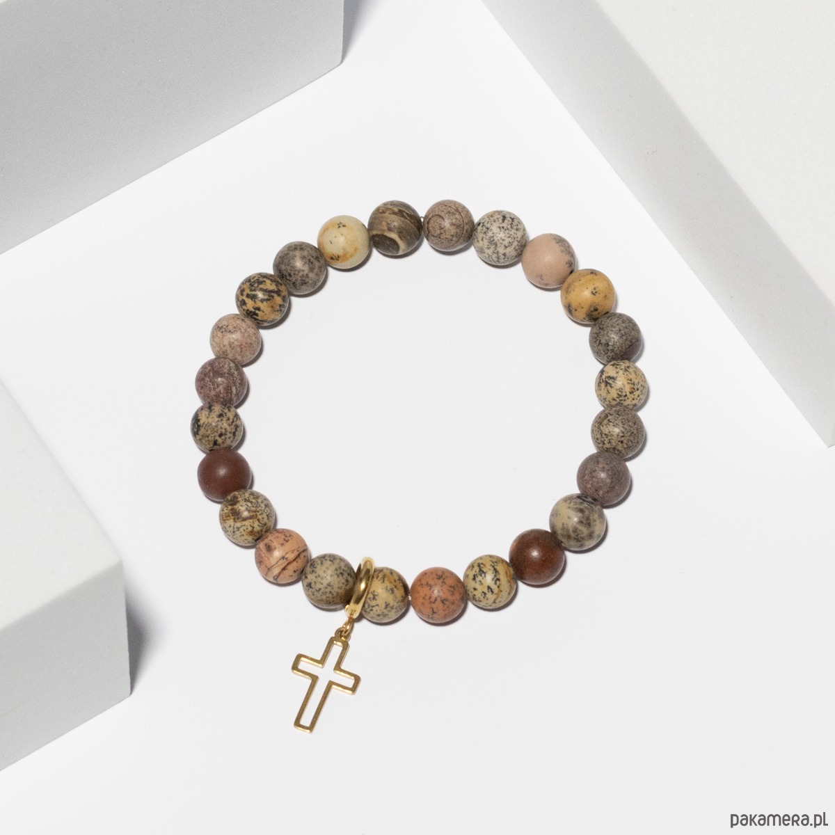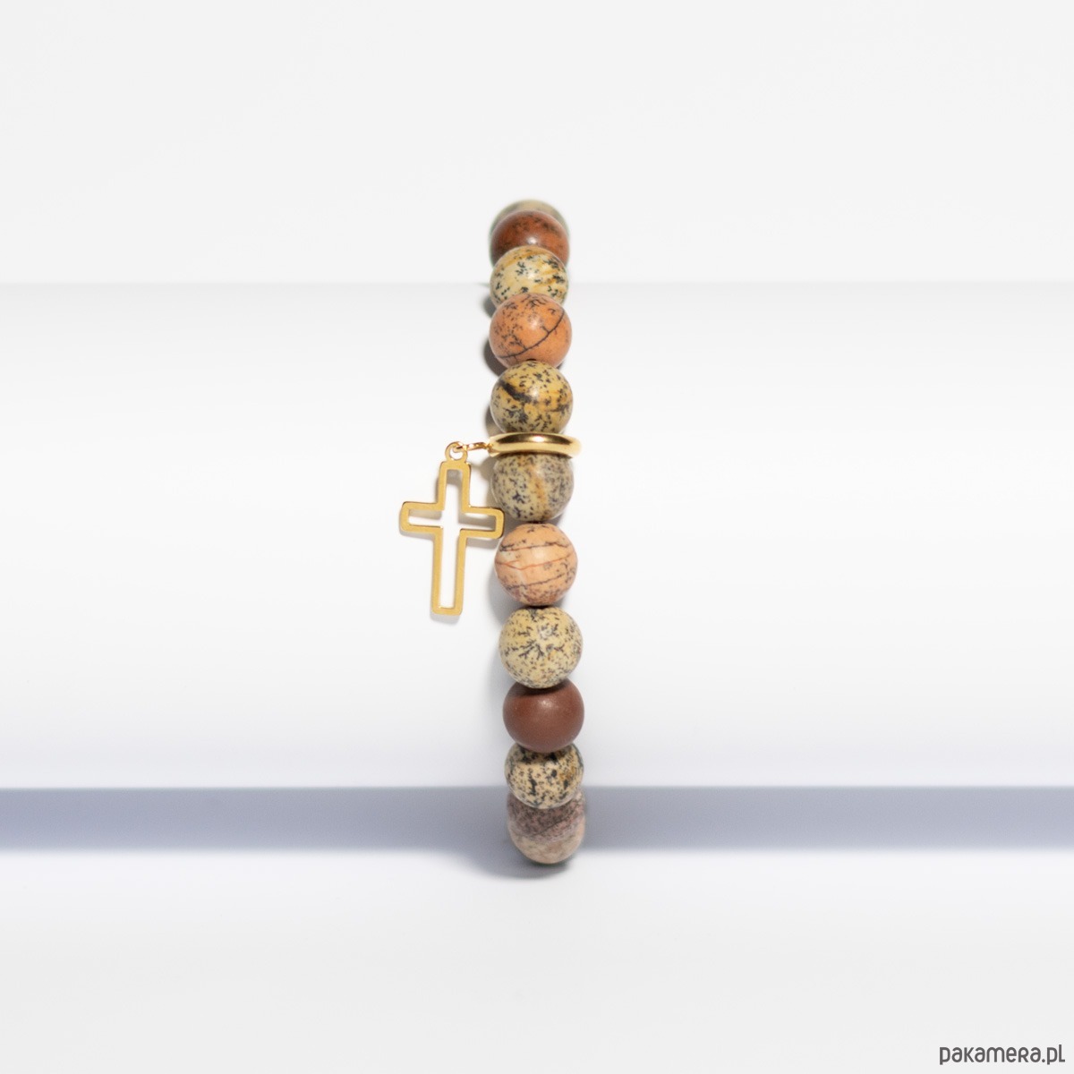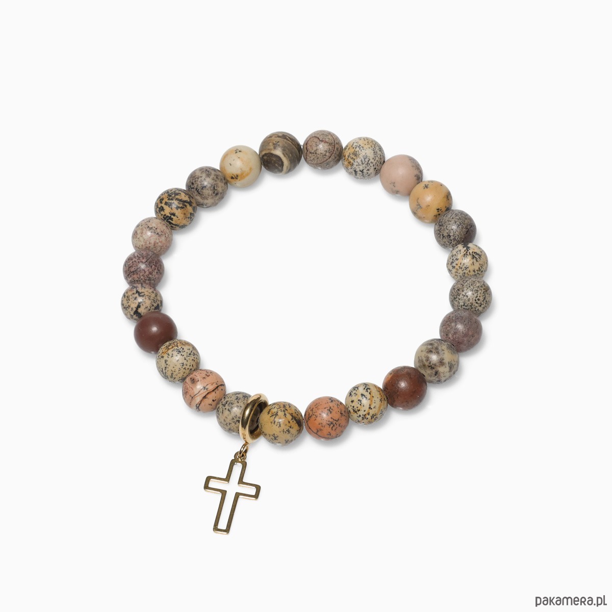 Dodatkowym akcentem jest krzyżyk wykonany ze stali szlachetnej 316L w kolorze złotym, nadający biżuterii nowoczesnego, a zarazem symbolicznego charakteru. To połączenie naturalnych kamieni i metalu wprowadza równowagę między subtelnością a wyrazistością.