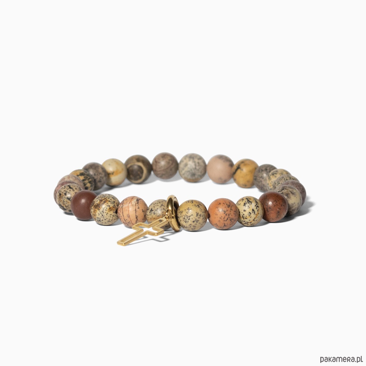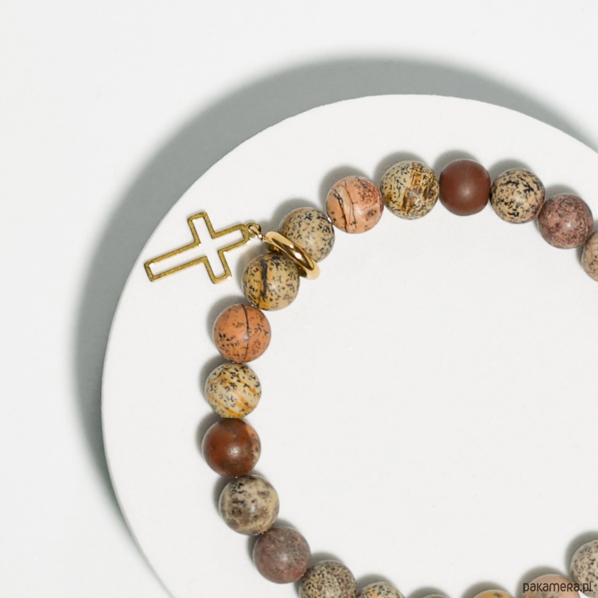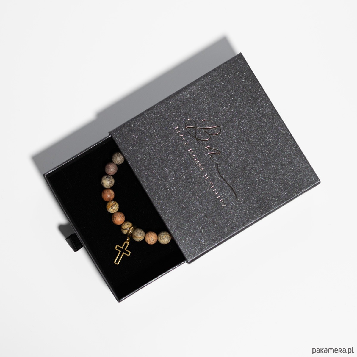 Dodatkowym akcentem jest krzyżyk wykonany ze stali szlachetnej 316L w kolorze złotym, nadający biżuterii nowoczesnego, a zarazem symbolicznego charakteru. To połączenie naturalnych kamieni i metalu wprowadza równowagę między subtelnością a wyrazistością.