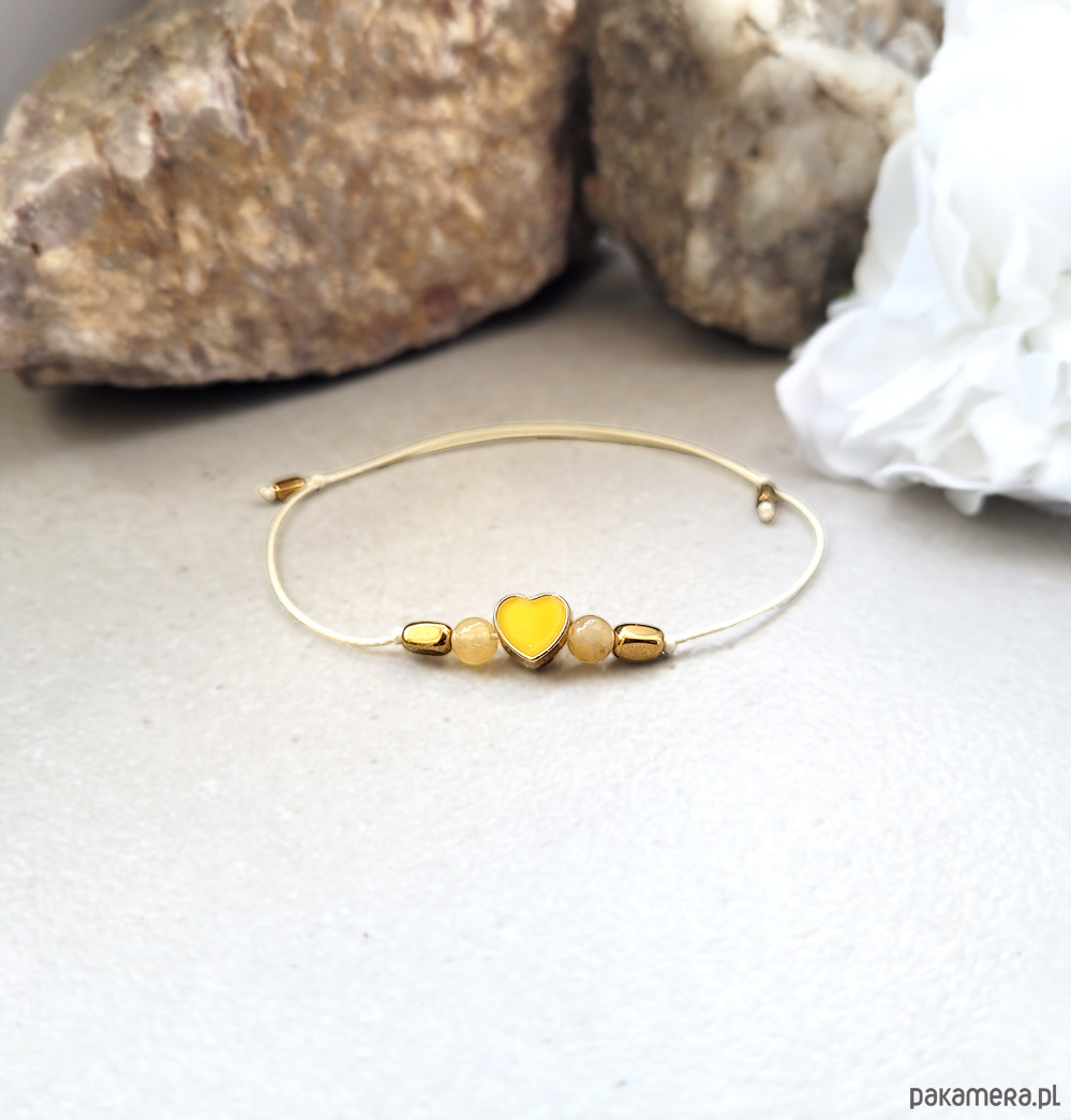 Delikatna minimalistyczna bransoletka zrobiona z kamieni naturalnych: Topazu, Hematytu oraz emaliowanego żółtego seruszka.