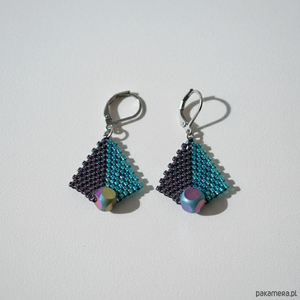 Minimalistyczne kolczyki o geometrycznym kształcie, wykonane techniką beadingu (ścieg peyote), to elegancki dodatek idealny na wieczorne wyjścia i specjalne okazje. Połączenie granatowych i morskich koralików Toho oraz unikalnych szklanych koralików tworzy niepowtarzalny efekt. Kolczyki są lekkie i wygodne w noszeniu, a ich geometryczna forma podkreśla nowoczesny styl.