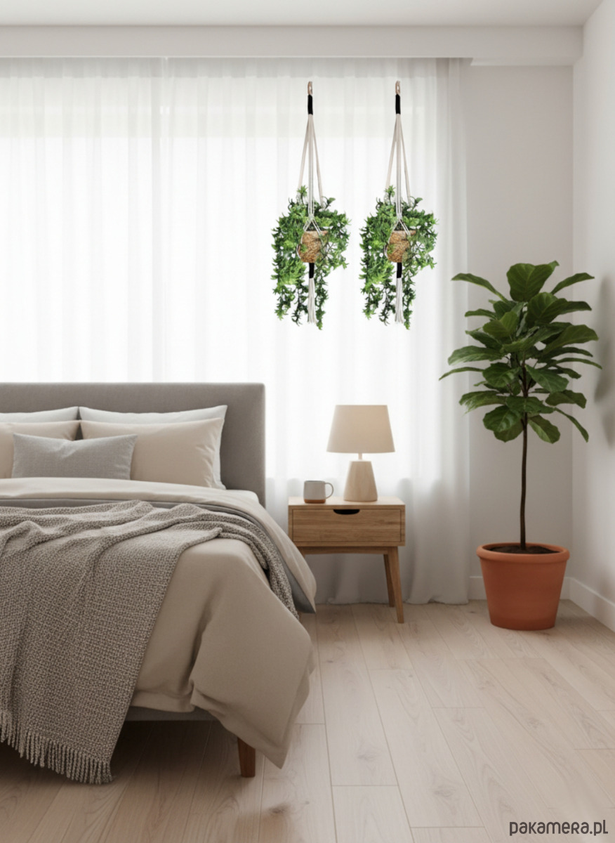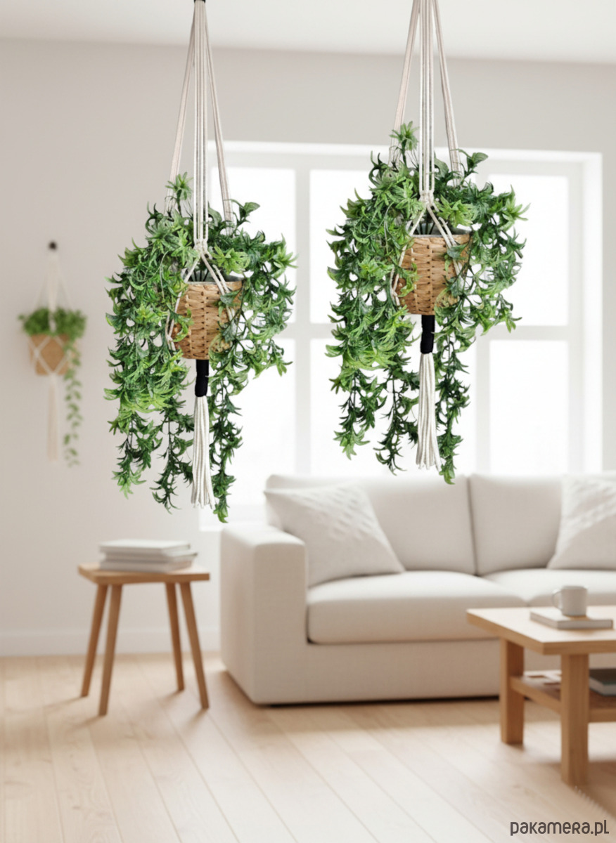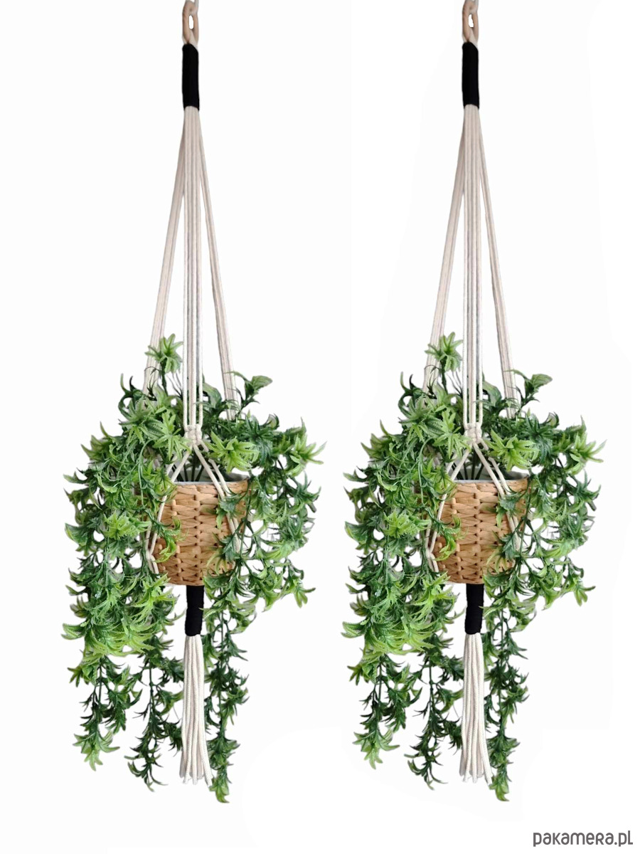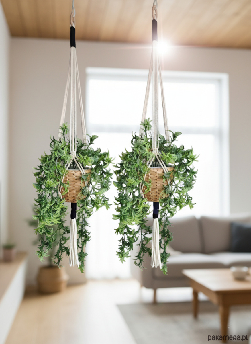 Zestaw zawiera dwa kwietniki makrama, które możesz zawiesić obok siebie lub w różnych miejscach w Twoim domu. To daje Ci możliwość stworzenia własnej galerii roślin, dodając przy tym eleganckiego i spójnego elementu do twojego wnętrza.