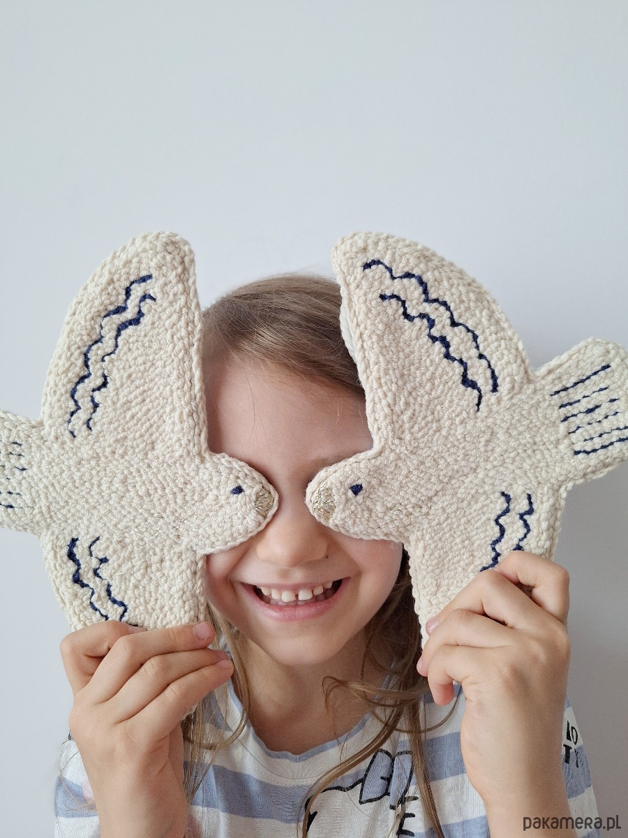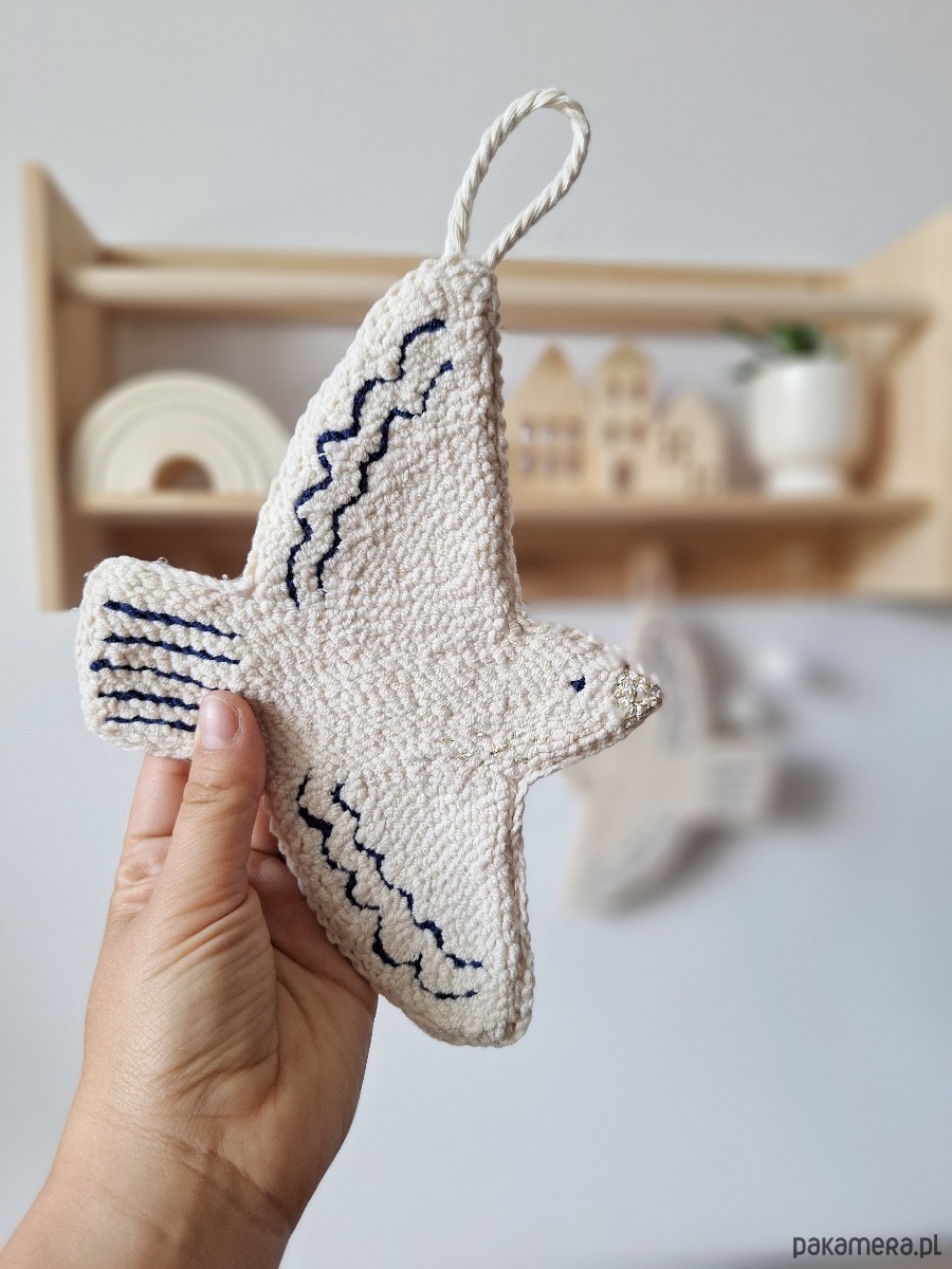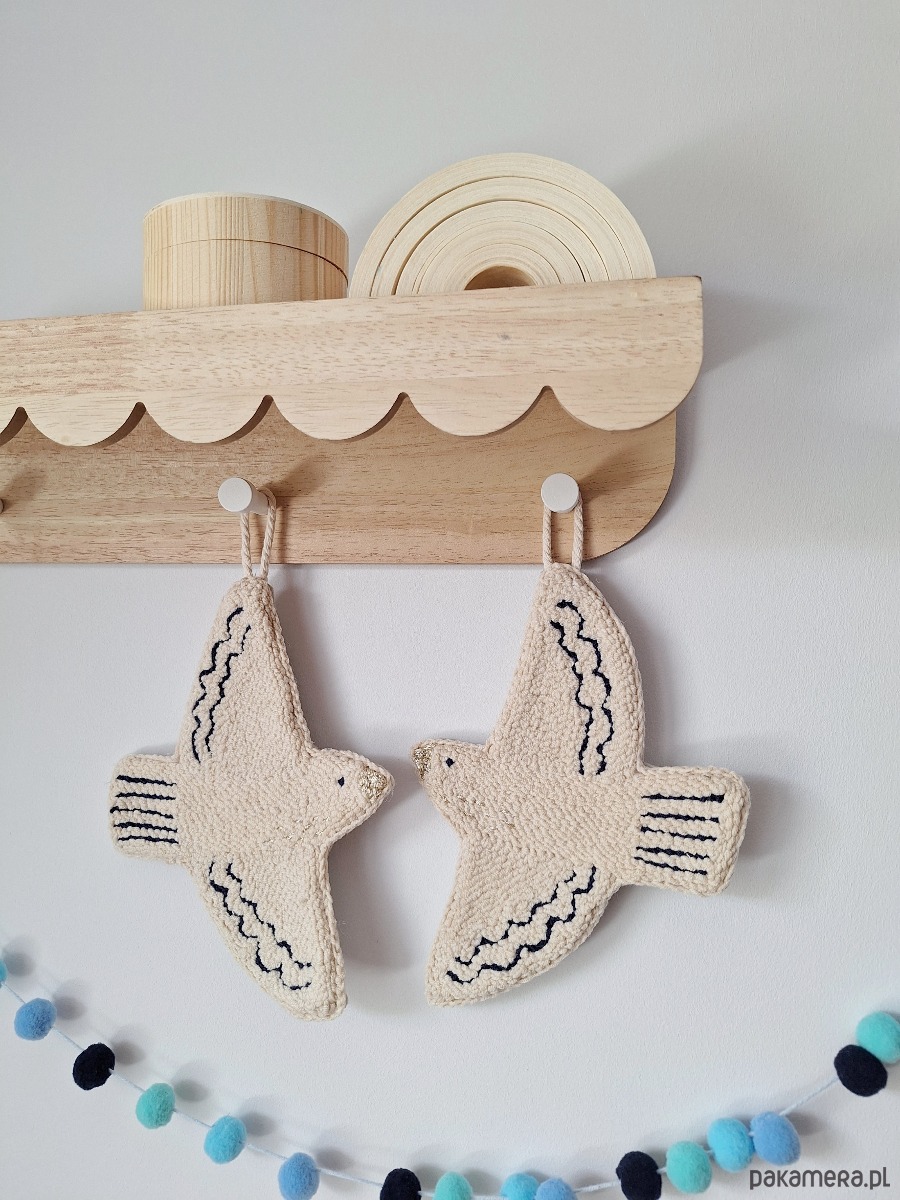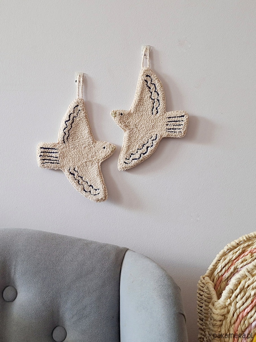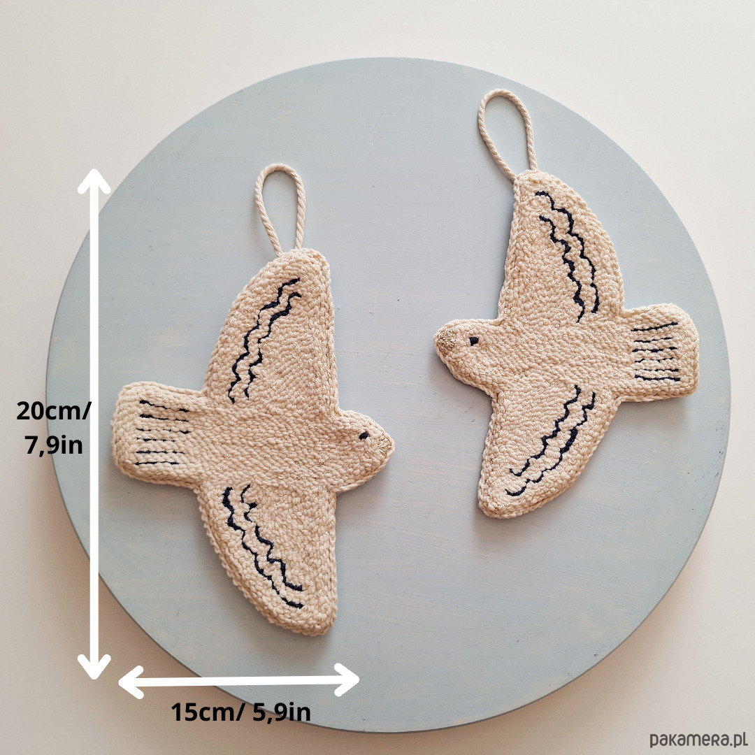 Zestaw dwóch dekoracji ściennych w kształcie ptaków, wykonanych metodą punch needle. Utrzymane w skandynawskim stylu, w kolorze jasnobeżowym z granatowymi akcentami. Idealne do pokoju dziecięcego lub wnętrz w stylu skandynawskim.
