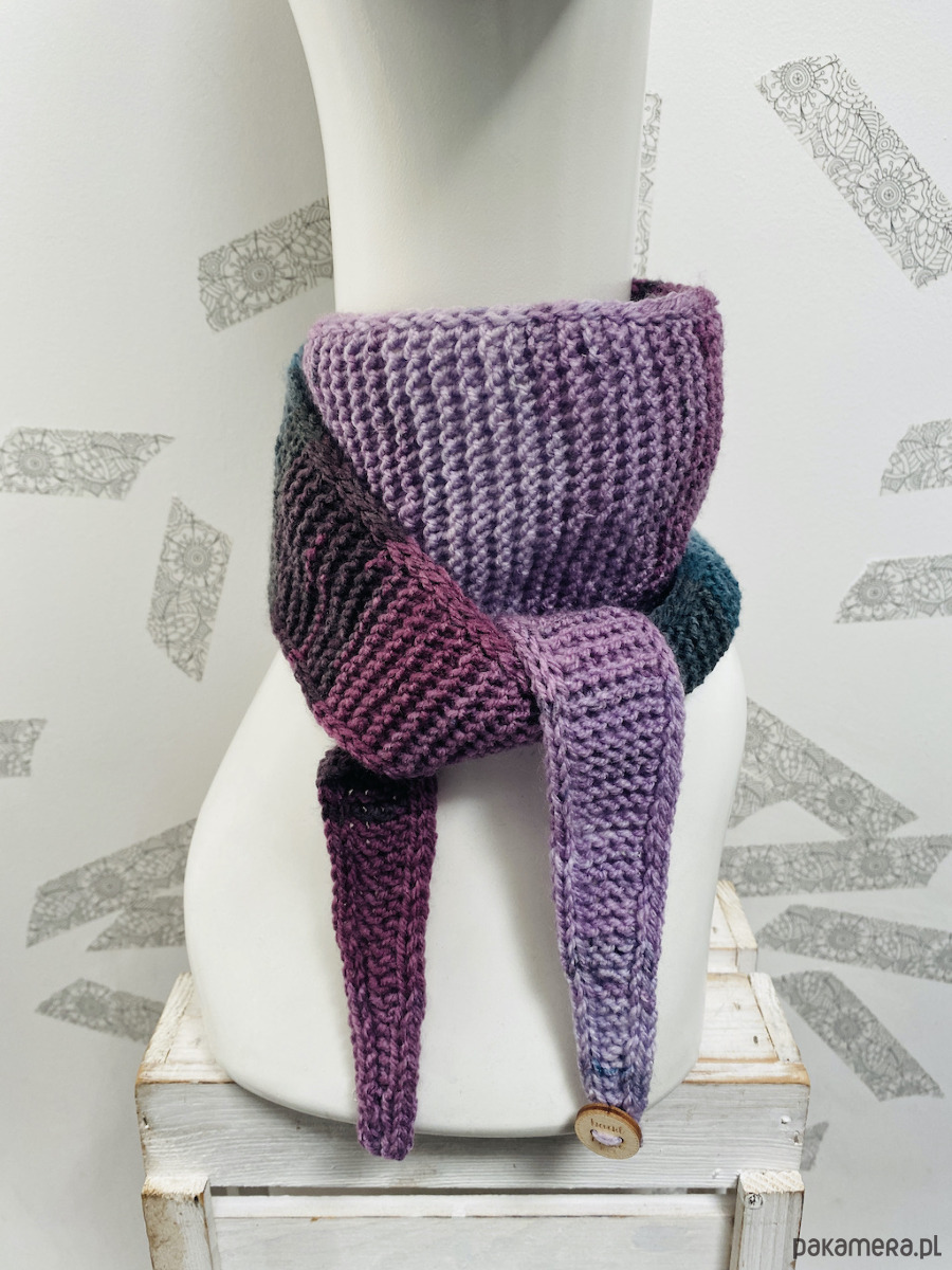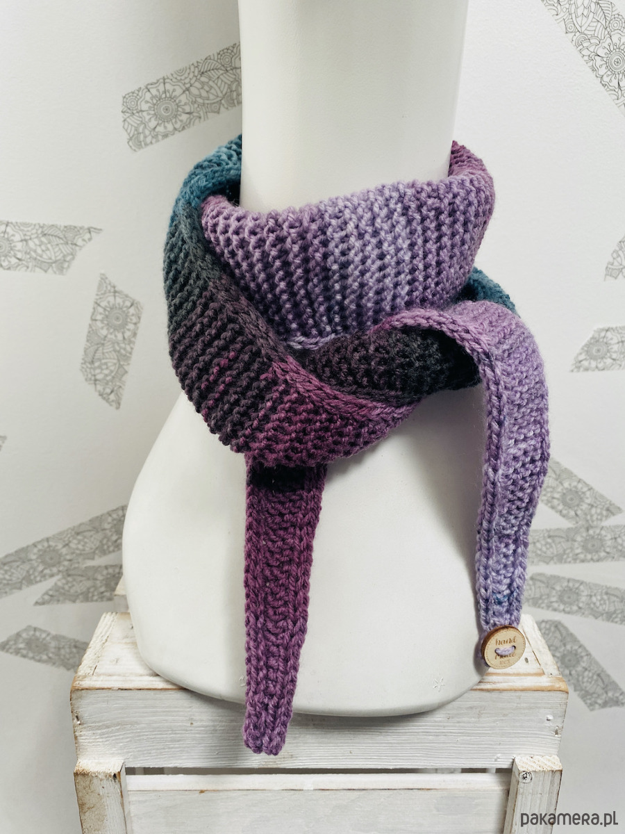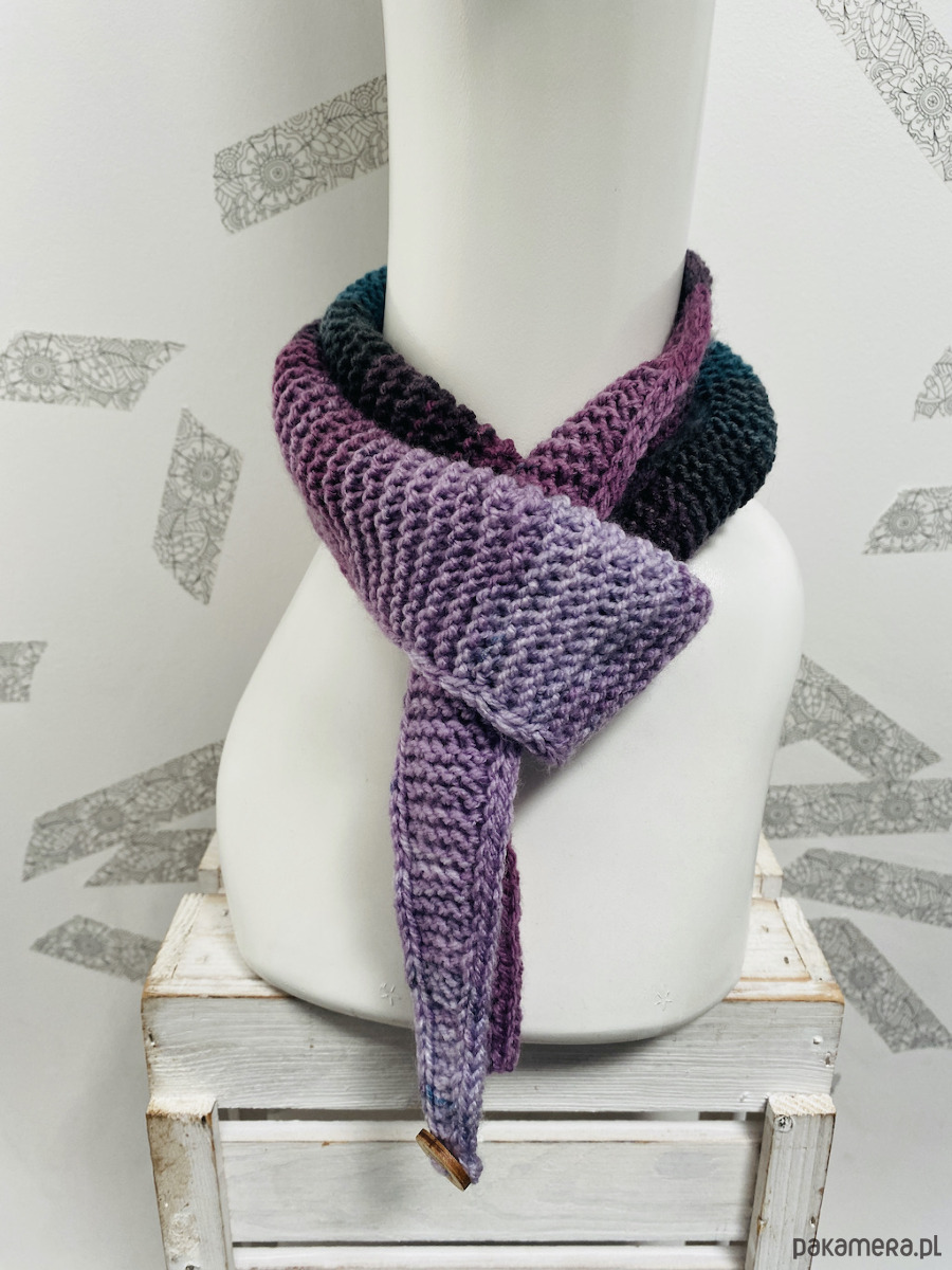 Ręcznie robiony na drutach dzianinowy szalik o krótkiej, wiązanej formie.