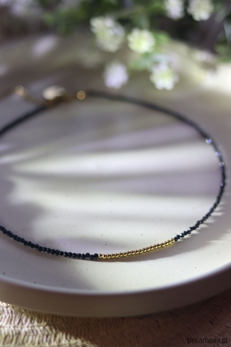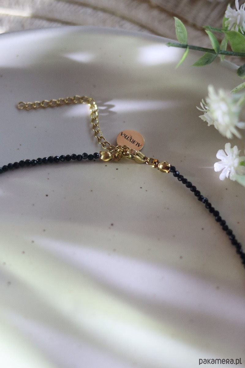 Ten delikatny naszyjnik został ręcznie wykonany z drobnych, fasetowanych kamieni czarnego turmalinu, które subtelnie połyskują w świetle, tworząc efekt eleganckiego, naturalnego blasku. W centralnej części znajduje się ozdoba z pozłacanej stali chirurgicznej, dodająca kompozycji lekkości i nowoczesnego charakteru. Całość utrzymana jest w duchu minimalizmu – bez zawieszek i zbędnych detali, dzięki czemu naszyjnik stanowi wyrafinowany akcent do każdej stylizacji.