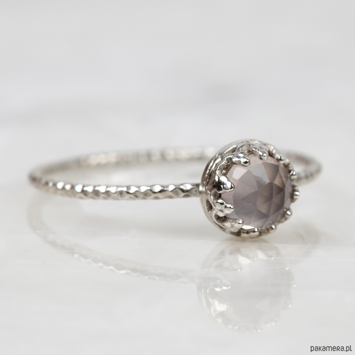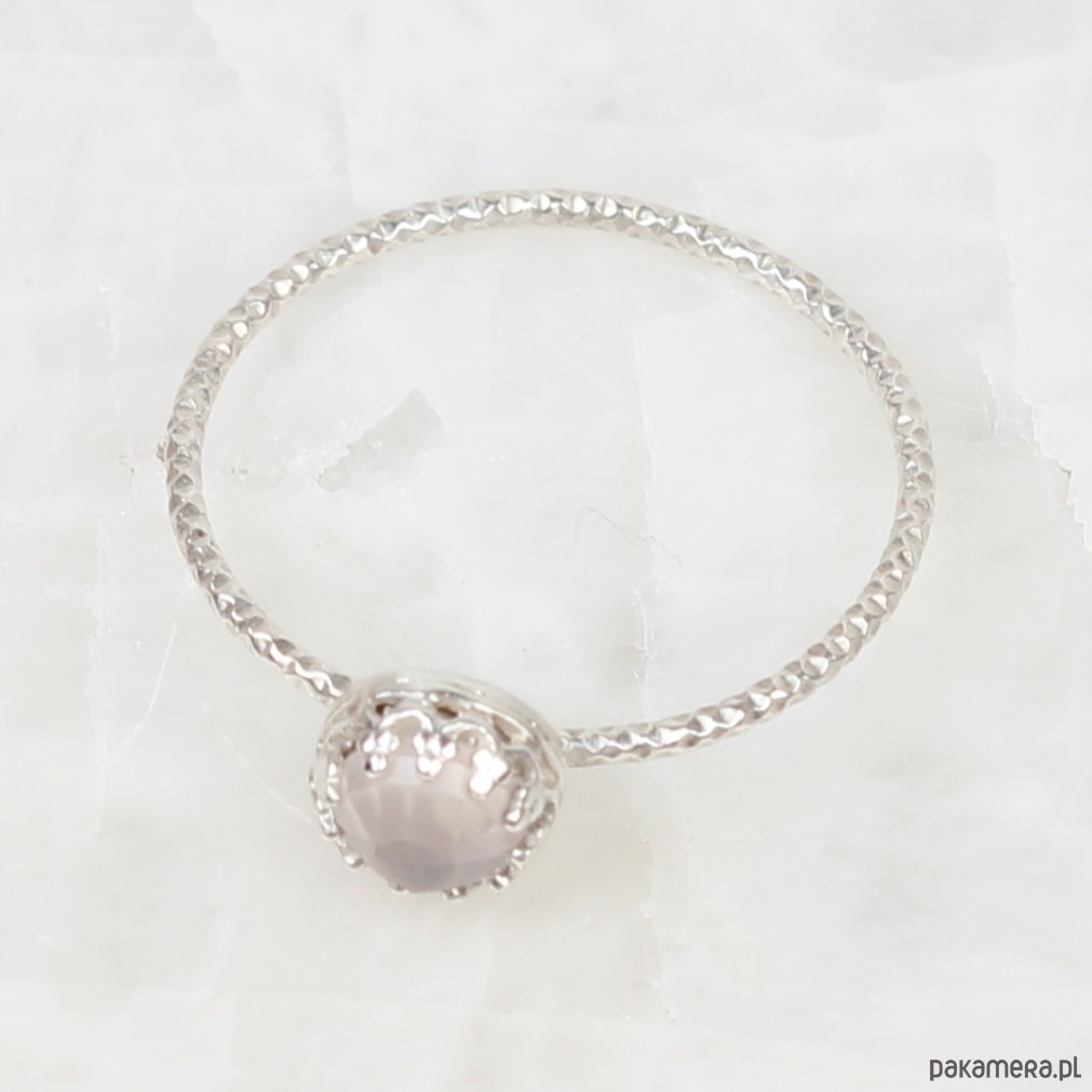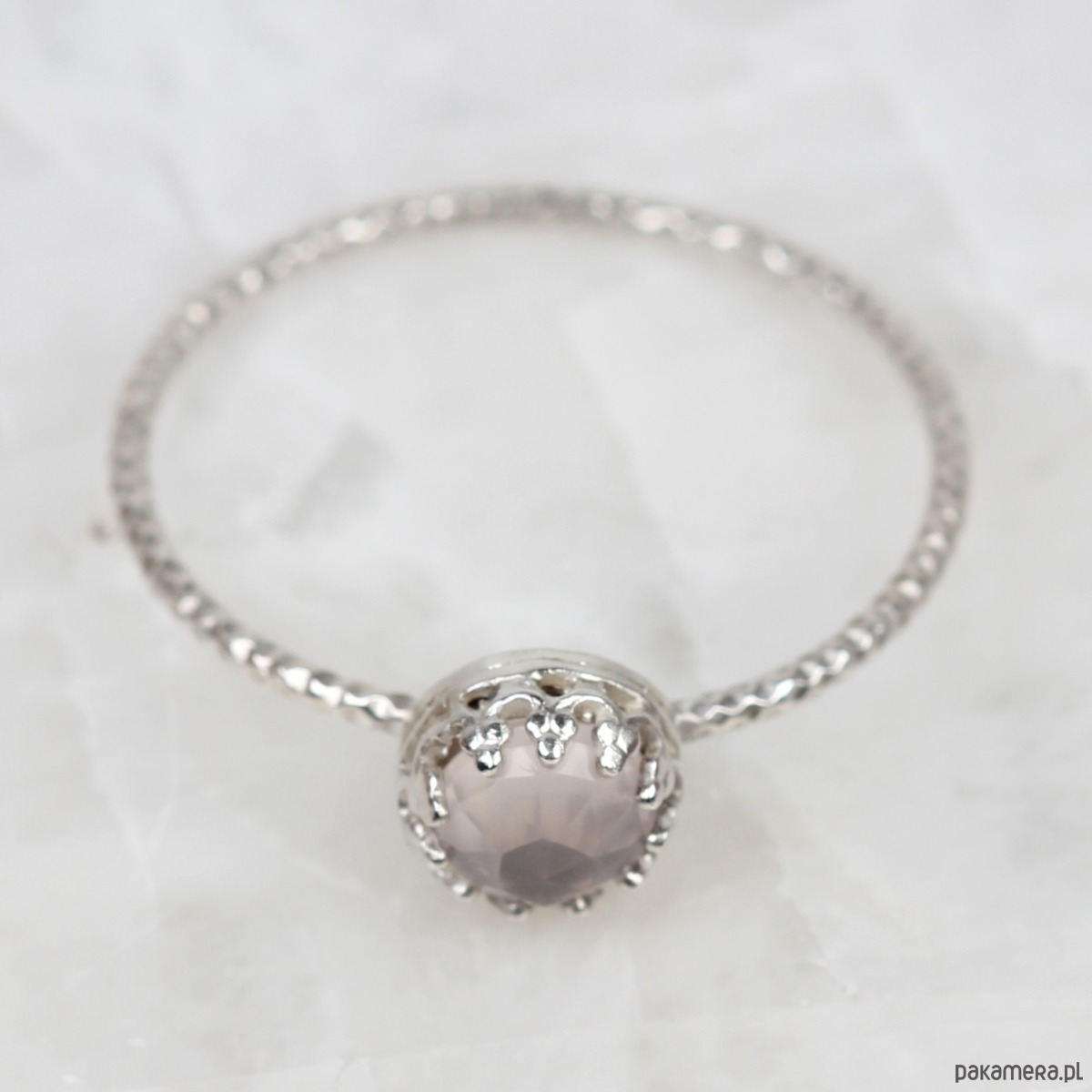 Ręcznie wykonany pierścionek z kwarcem różowym ze srebra z przepięknie fakturowaną obrączką i ozdobną cargą wokół kamienia w stylu Vintage.