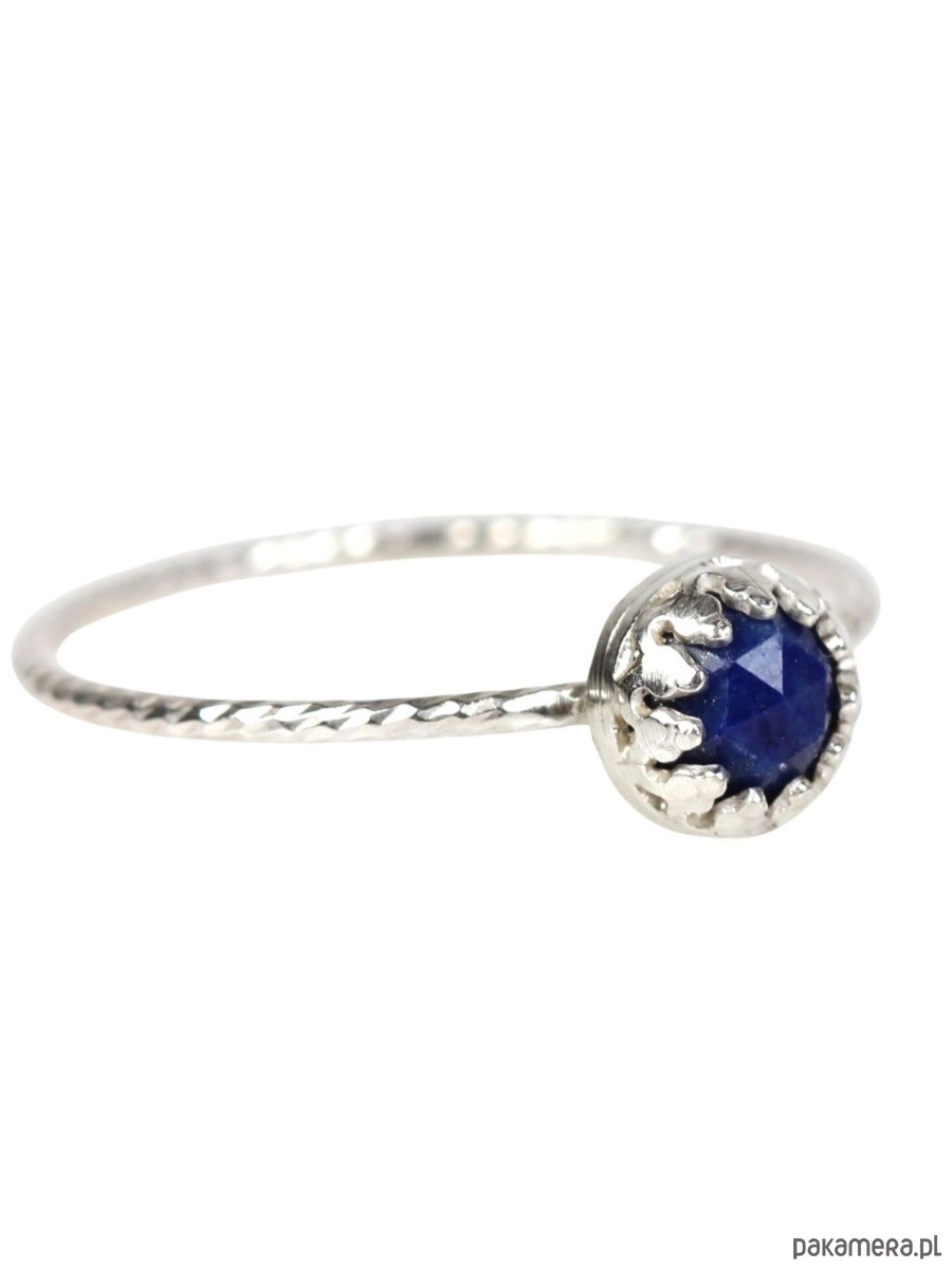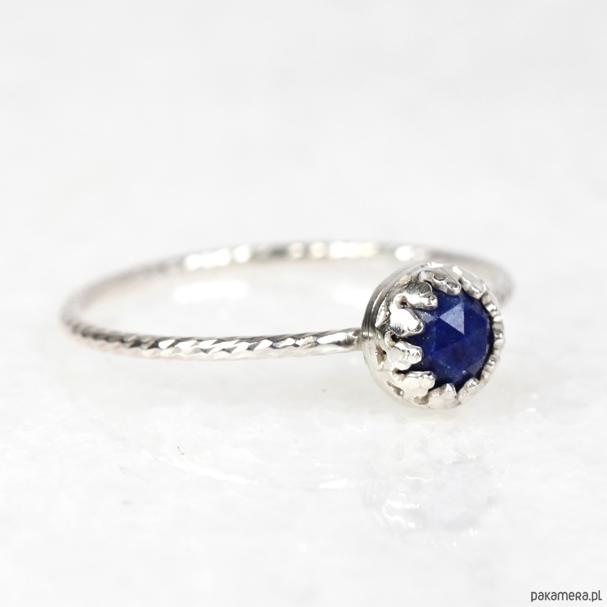 Ręcznie wykonany pierścionek z lapisem lazuli ze srebra z przepięknie fakturowaną obrączką i ozdobną cargą wokół kamienia w stylu Vintage.